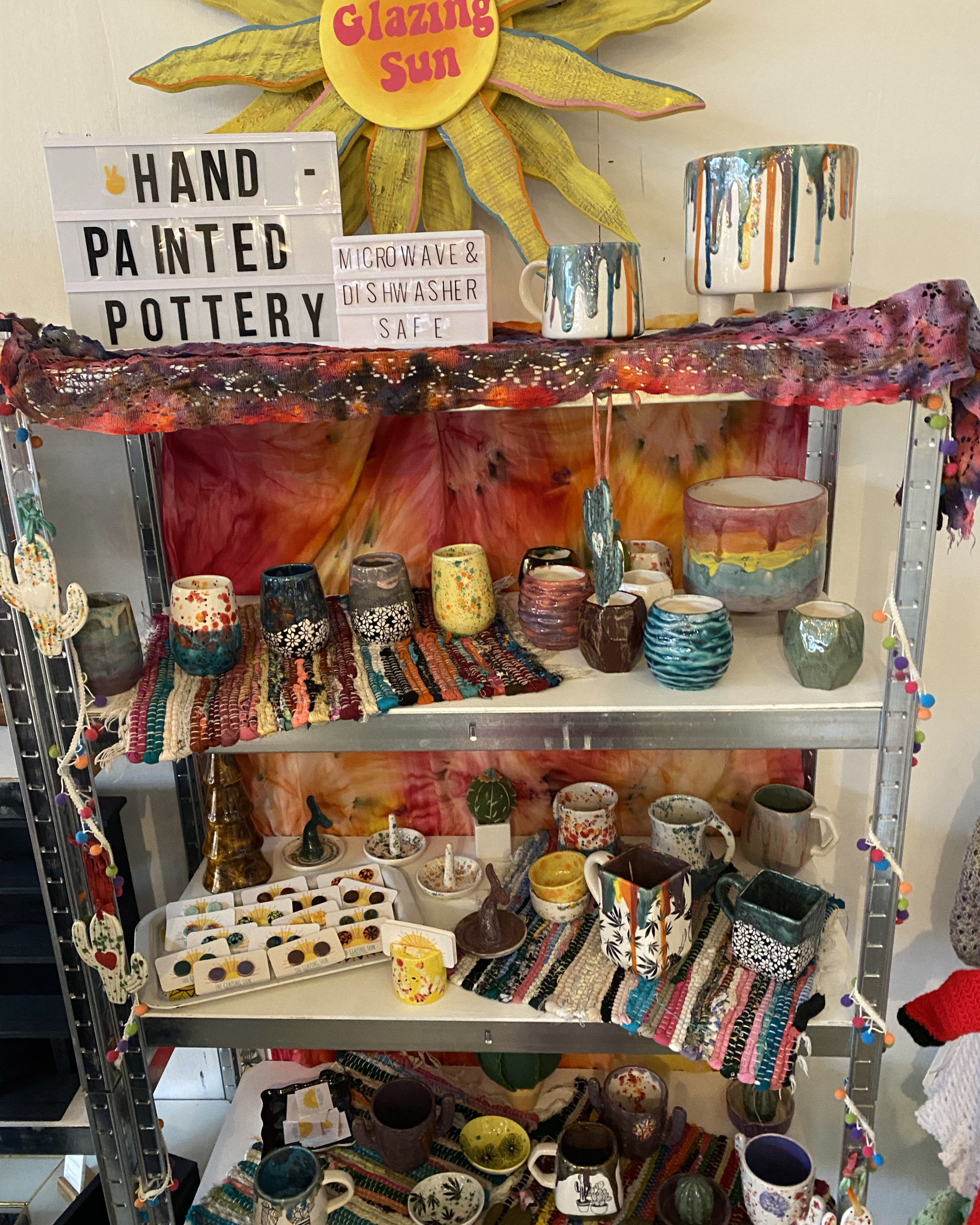 Alana: Hello!! I am a 23-year-old ceramic artist in Wrightsville PA (a river town about an hour west of Philly)! I recently married my high school sweetheart in an amazing backyard wedding. We are soon on the route to house hunting! Right now I paint in the studio I set up in my attic at my mom’s house. I absolutely love where pottery is taking my life! When I graduated high school, in 2015, I decided I would go to Nursing School. My part time job, while going to college, was a Paint Your Own Pottery Studio in Downtown Lancaster, called The Pottery Works. I always loved art of any kind and I was immediately obsessed with this new way for me to create art. I loved painting; watercolor, acrylic, and oils in my art classes. As I started working at The Pottery Works, I fell in love with the idea of having my own small business one day. I decided to make a change in my career path and go to school for business. I started painting pottery from the PYOP studio and selling it on the side. Today I have had The Glazing Sun for almost 4 years! The pandemic really soared my Etsy shop into orbit with everyone online shopping and it has been so amazing taking The Glazing Sun full time!