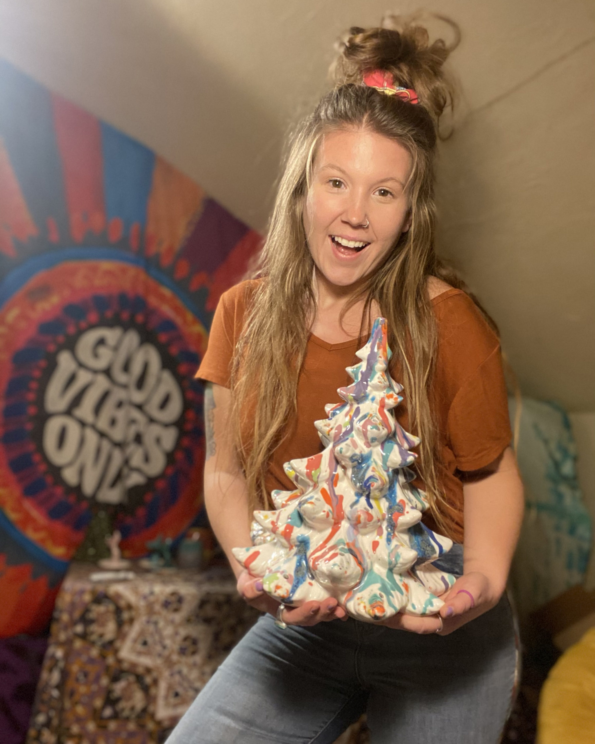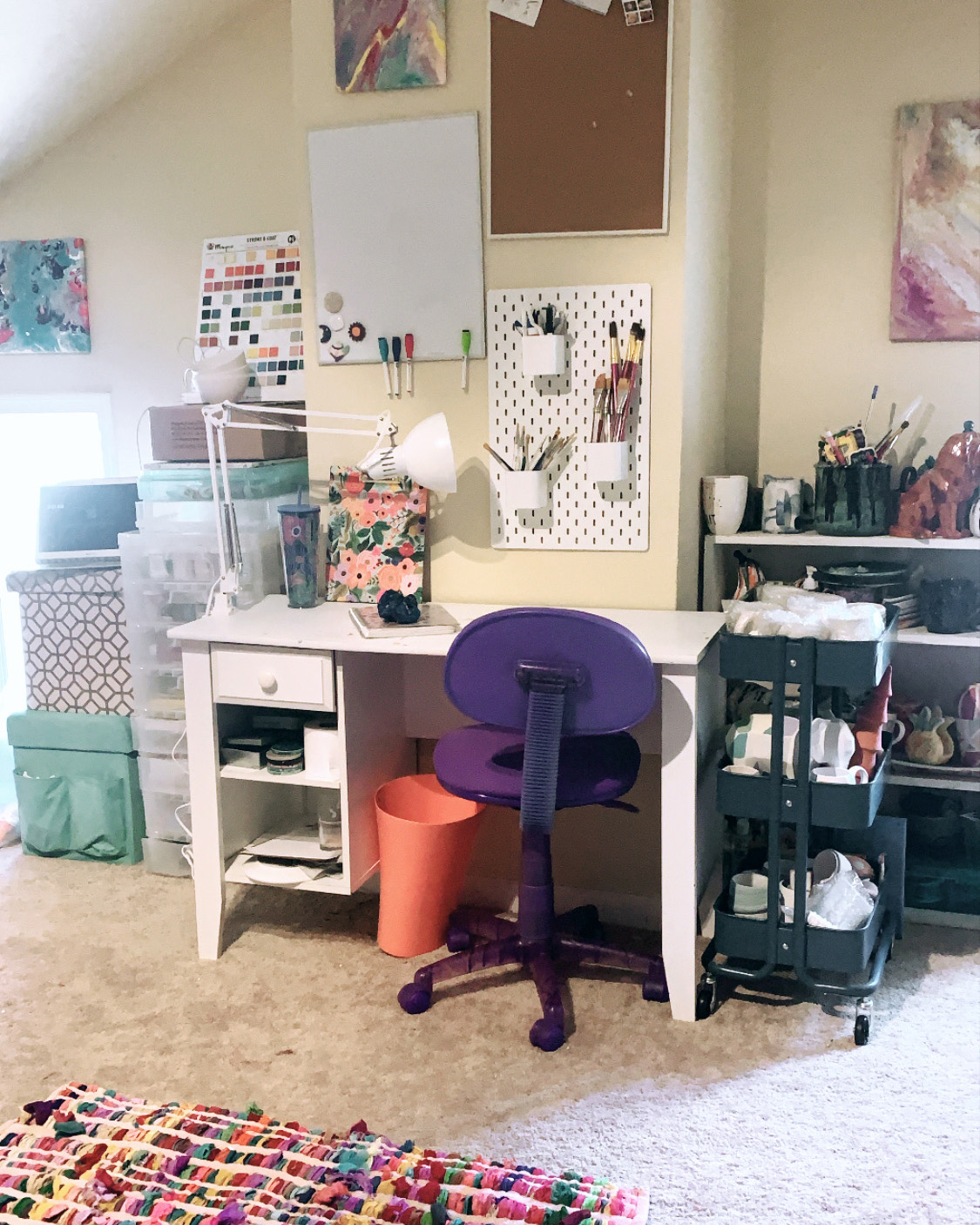 Currently my studio is in the attic at my momma’s house and I am so fortunate that it is available to me because I have no idea where I would run this business without it! I like that it feels like a separate place in the house, when I go up there it really feels like The Glazing Sun’s space. The environment is SO important to the conceptualization in my work – I used to just paint in my room or at the kitchen table and my production has totally changed when I moved into the attic. A creative work environment has to feel like a safe space to me and when I walk in there (as long as it isn’t messy) I feel so at peace when I sit down to paint. I have wall art, cute chairs to sit and take a break on, tapestries, and other fun touches to fuel my creativity everyday. I listen to podcasts while I paint – music is too distracting for me when I paint.