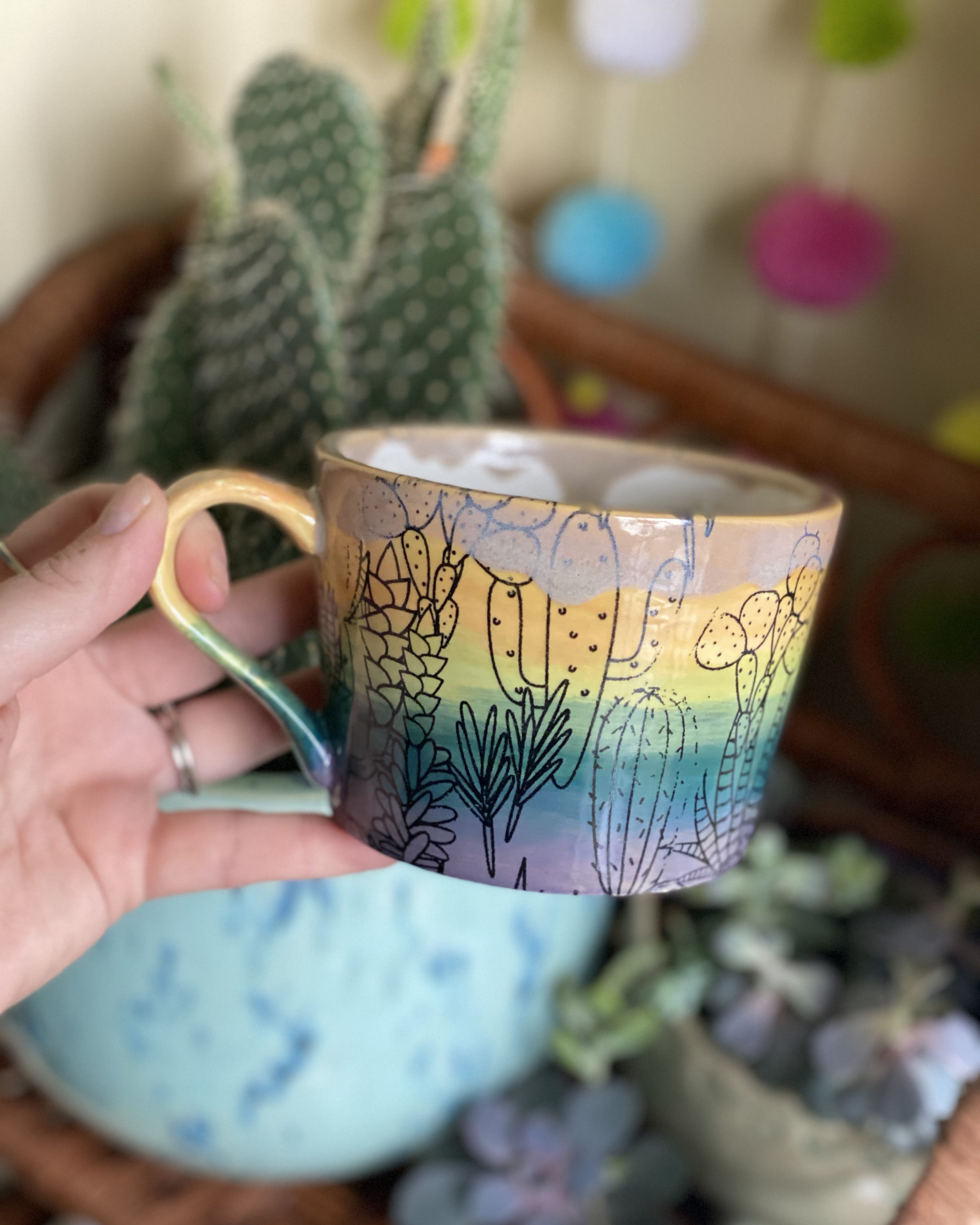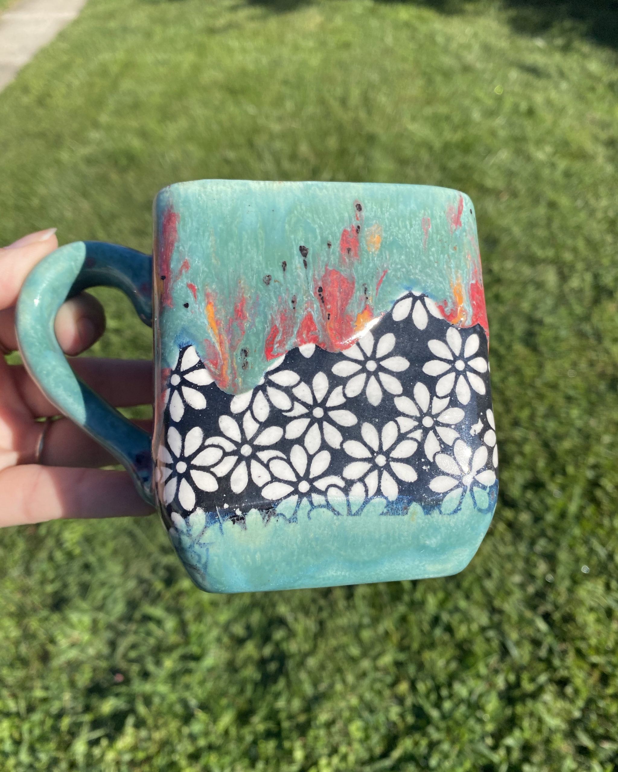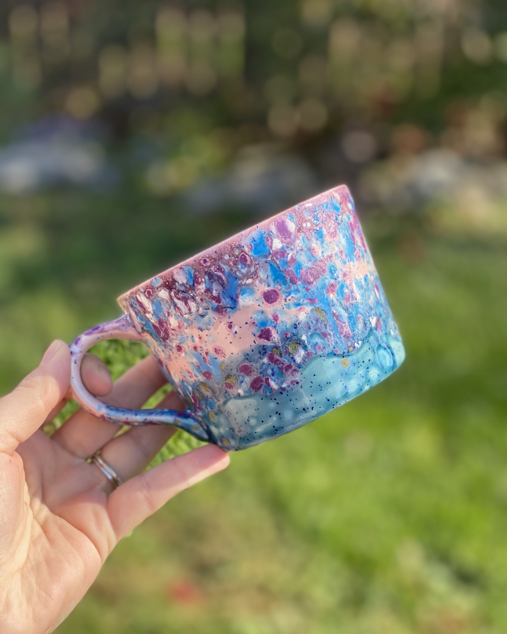 The first influential experience on my career was in 2017, when I decided to take pottery painting from a hobby and test it out at a craft show. I live in a river town, so I am very close to a bridge and every year we have the Bridge Bust – a craft show that lines the entire bridge with vendors! It was so much fun, I got to see and hear the reactions of customers when walking into my stand. I did amazing that day, made a lot of money, and that is when I realized I had a REAL thing going for me. A more recent experience would be this year when I created my Rainbow Mug. It really took off on Instagram and soared my Etsy. It was the first mug I painted that I felt really looked like I used high fire glazes using low fire glazes!