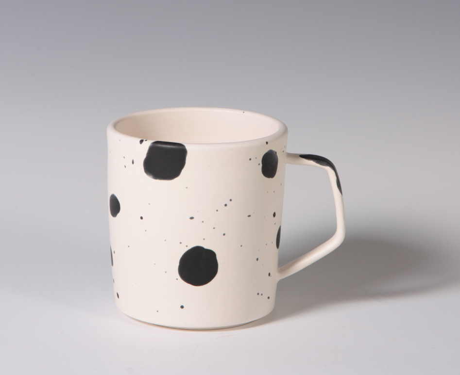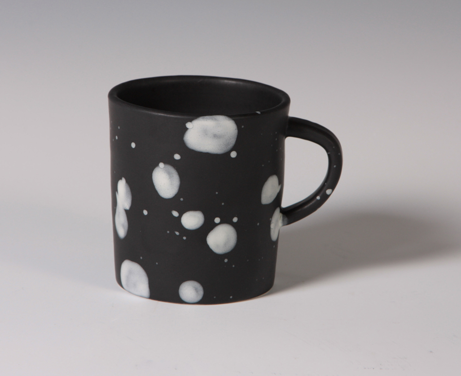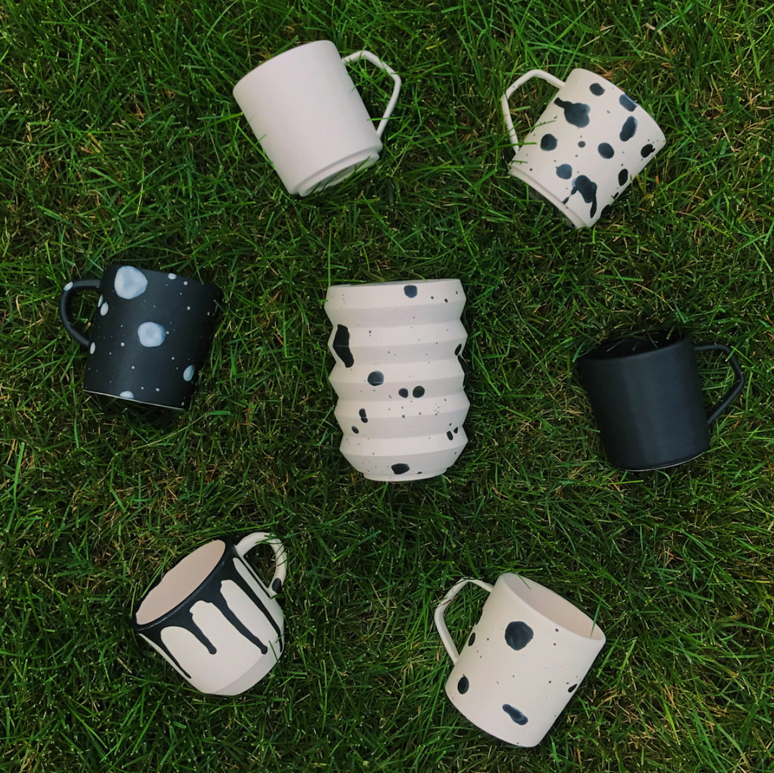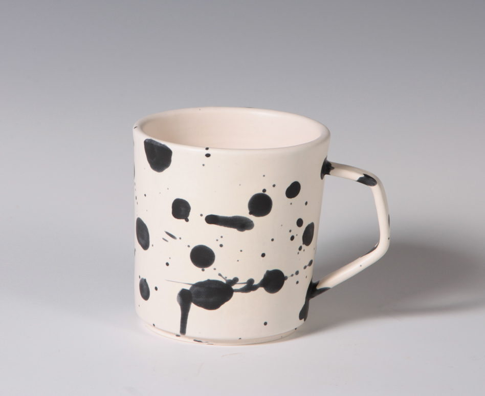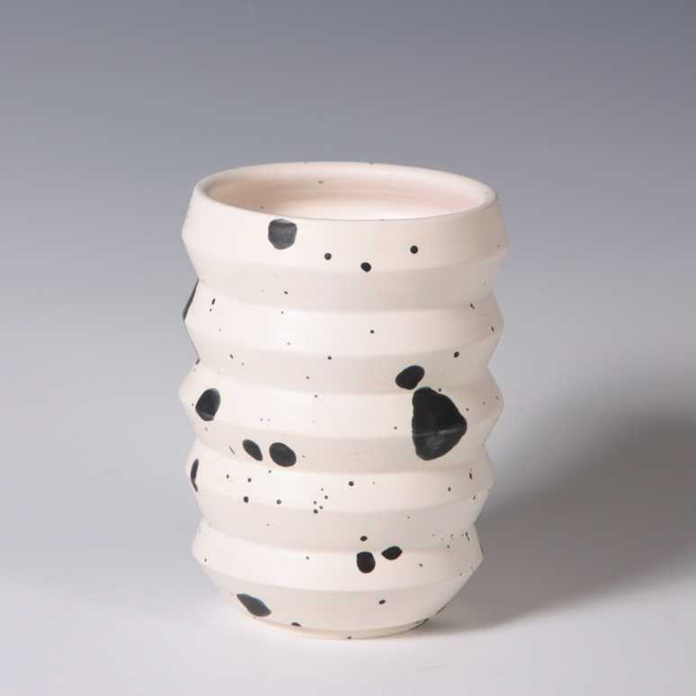 In my work I am drawn towards geometric shapes, smooth and clean surfaces and simple yet playful surface designs. When throwing and shaping my forms on the wheel I use various types of ribs to achieve a clean surfaces and sharp angles. Further smoothing and perfecting of the form is done when trimming. What inspires me to make these forms is the amount of control and precision needed to make them. I enjoy challenging myself to make the best work I can. There is a lot of gratification in being able to make a crisp form with sharp angles and clean lines from a material that is naturally very messy and hard to work with. On my surfaces, I like to experiment a little more, keeping some work very plain and simple while adding patterns and decoration to others.