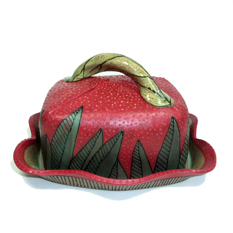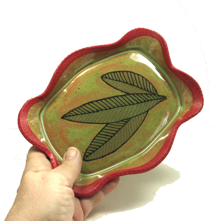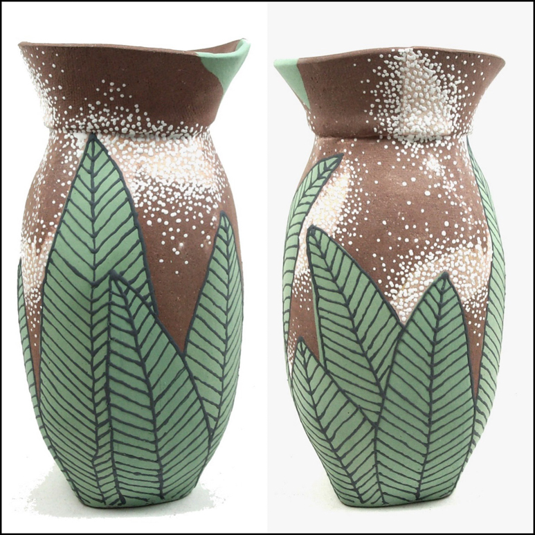Barbara: Before I found clay, I ate, slept and breathed interior and architectural design, and spent all of my time engrossed in the needs of others. I had no life without my client list. Then in 1994 while on vacation, I attended a workshop given by Jeanne Haskell at The Vermont Clay Studio in Montpelier, Vermont. At the time, I didn’t know the difference between wet clay and the mud in my driveway, but once my hands started poking and stretching and feeling the hunk of clay I was allotted, I knew I had to learn more. Upon returning home, I immediately signed up for classes at Perkins Center for the Arts in Moorestown, New Jersey and The Clay Studio in Philadelphia, Pennsylvania. I took workshops offered by clay artists whose work I came to admire through area galleries and national publications. I was being consumed by all things CLAY. The more I experienced, the more I realized there is to experience, and the more I needed to ‘do clay.’ Although I didn’t start out on the wheel learning to make strictly functional ware such as plates and bowls, I did begin hand building very utilitarian pieces. I love gladiolas, and I never had a vase tall enough to hold them, so I slab built a whole series of ‘GLAD’ vases. Three of the first ten leaked, and I quickly learned about properly attaching a bottom and testing for water-tightness at the bisque stage. At classes and workshops I was introduced to texturing and stretching clay, building forms which have three-legs, lids, handles or spouts and using engobes such as terra sigillata as alternatives to glazes. I raku-fired with Steve Branfman in Vermont, sawdust-fired with Jimmy Clark in Chester Springs and was quickly becoming a clay junkie! Sometimes my drug of choice was stoneware; sometimes earthenware with an occasional snort of cream cheese porcelain. Other times I reached nirvana by simply burnishing or texturing the various clay bodies I had on hand. Intent on exploring everything I had been exposed to in more detail, I mentally filed away ninety percent of the information for future exploration, then set about starting at the beginning and mastering the three basic hand building techniques of pinching, coiling and slab construction. Finishing a pot with the right glaze was always harder than making a good clay form. Glazes never were explained or discussed at length in any of the classes I took at area art centers; our work came out of the bisque firing and we were expected to thoughtlessly dip our pieces in buckets of runny liquid to create a finish. For years I fought this idea and turned to brushing or pouring glazes on my bisque ware. Then I had an epiphany – the clay slabs I roll out are the fabric I use to make my pieces. If I were a fashion designer, would I attempt to manufacture a line of clothing without first envisioning the colors, textures or patterns of the fabrics I would use for each creation? Of course not! So, why was I doing this as a clay artist?  Why was I building forms out of clay ‘muslin’ when I could be using clay fabrics rich with textures, patterns and colors. I began fantasizing about clay surface finishes and to this day, I’m still discovering profound ways to influence the clay at the conceptual, greenware stage. Dedicated to becoming familiar with ALL my options, I constantly draw upon my years of acquired knowledge asking ‘what if’ every time I sit down to interact with clay. Recently the ‘what-if’ query led to my discovering Mayco Designer Liners and all they can do; my work hasn’t been the same since.