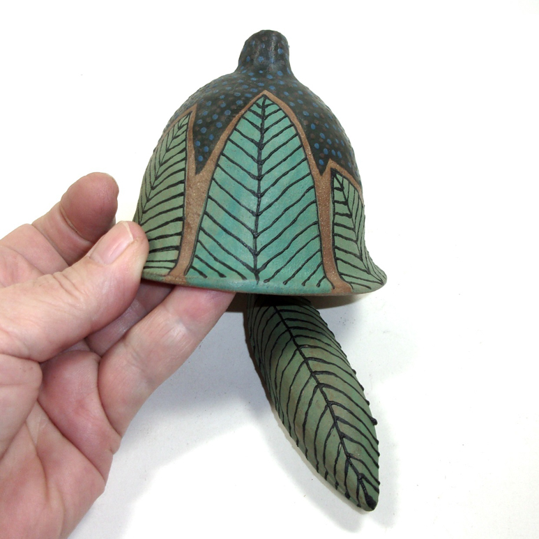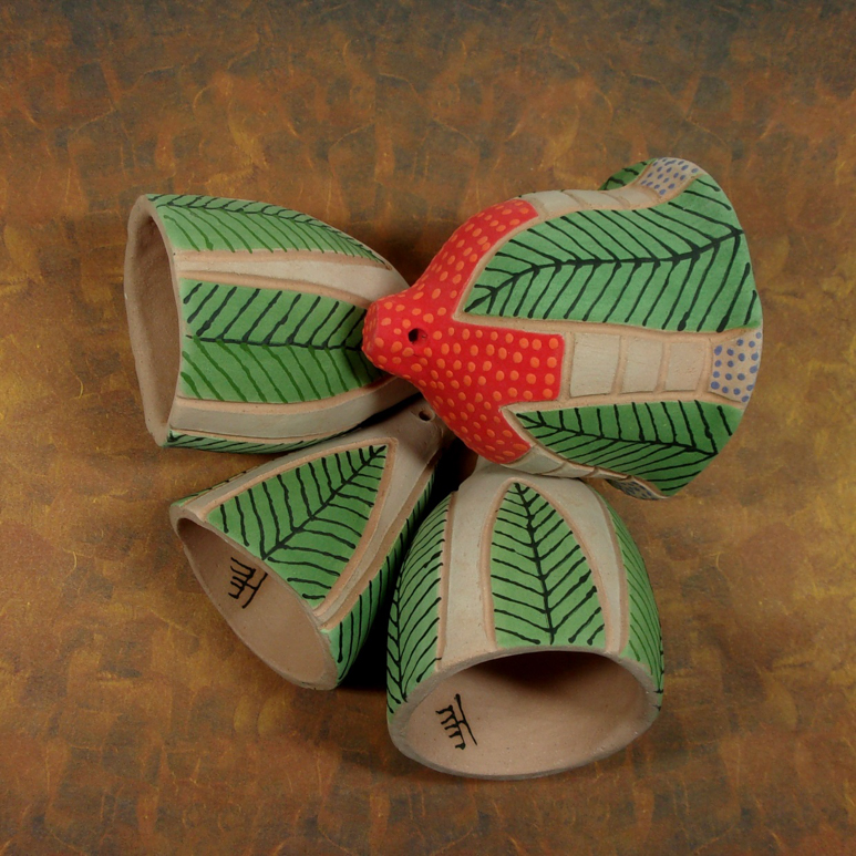 First I wanted to build with clay, eat off its river rock surface and drink from the empty spaces it defines. I then wanted to hear the sound of clay as it moves to and fro within itself or as it tries to be its own call in the wild – so I make Rattles which memorialize beginnings and Garden bells. Next I wanted a total “Clay Shibumi” where I am the adaptable turtle or the Bodhi leaf I impress in the clay’s surface; where I know the power of each single hand-formed bead touching my skin. I want to be what the clay is saying as I wear it and fondle it (the way old Greek men stroke their worry beads). So I strive to compose with the language of clay and I eagerly impart the intriguing ways of clay to anyone willing to listen.