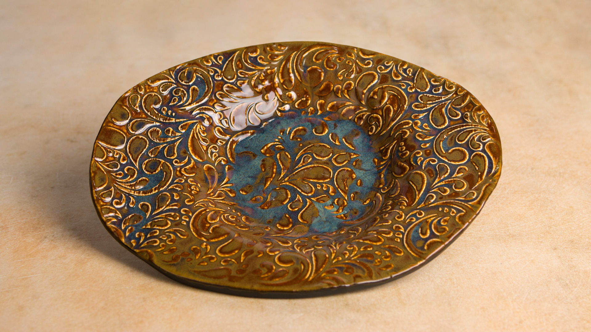 Elements™ are a two-tone glaze with a main color and a secondary color called a float. When Elements™ are applied to textured pieces, the float color will appear in the crevices.