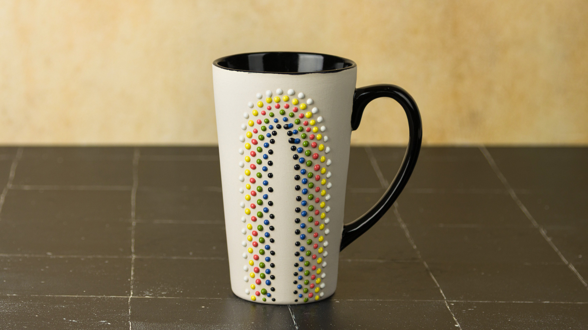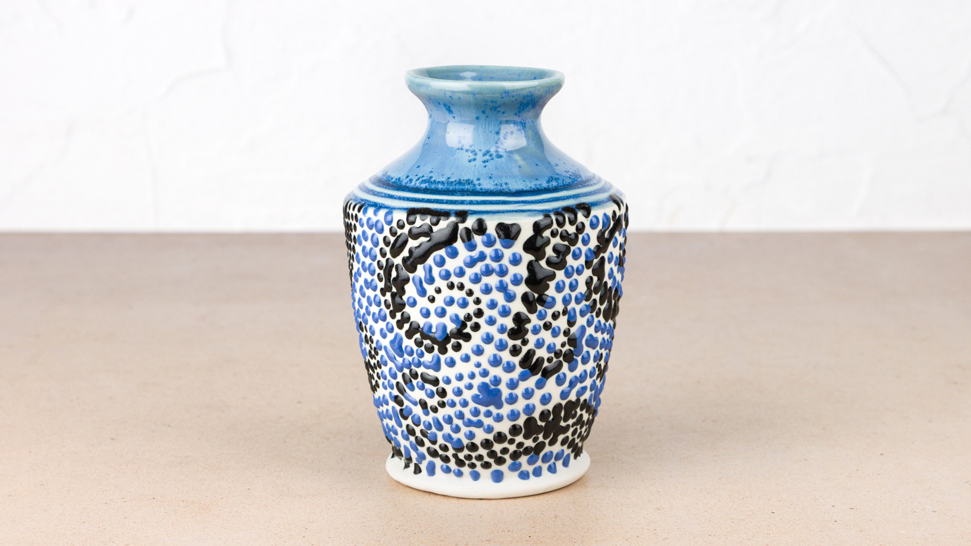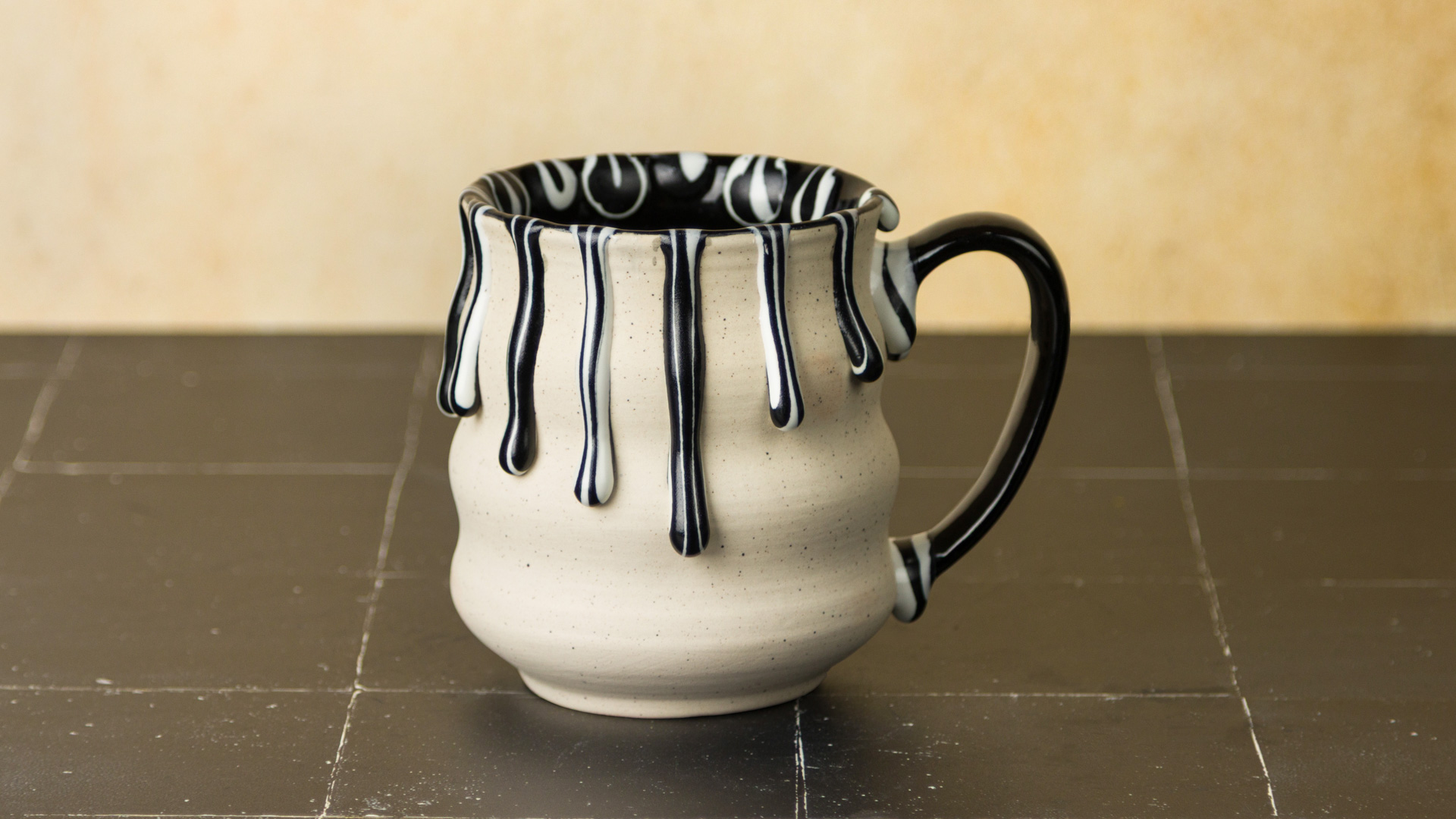 Basic Application: Apply dots in varying thickness and patterns to greenware or soft-fired, cone 04 stoneware bisque (1940°F/1060°C). For more movement and a dripping effect, apply larger dots on a vertical surface. The glaze can flow over textured areas. Continuously shake your applicator tool during use to eliminate air bubbles that can disrupt the flow of glaze and cause uneven texture or splatter. Allow the glaze to dry. It is recommended to fire your piece as soon as possible to prevent issues with glaze adhesion. Fire to preferred temperature; cone 5-10 (2167°F-2345°F/ 1186°C-1285°C). Sample tile was fired to cone 6 oxidation (1222°C/2232°F). Testing is recommended. Results may vary.