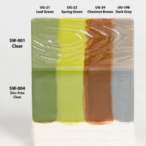 SW-004 Zinc Free Clear is a specialty clear glaze designed for use on glazes containing chrome-based pigments. The colors that we strongly suggested using Zinc-Free Clear to maintain color are UG-21 Leaf Green, UG-22 Spring Green, UG-198 Dark Grey, UG-210 Forest Green, UG-232 Olive, SG-405 Designer Liner Green, and EG006 Sparkle Black Engobe. Zinc-Free Clear with these colors ensures that you will get a brilliant, smooth, and crystal clear surface over these colors. Fire to cone 5/6. Carbon trapping and a milky haze may develop at cone 9/10.