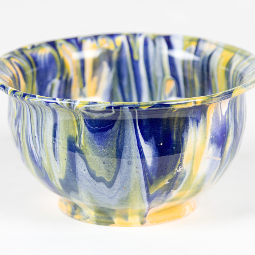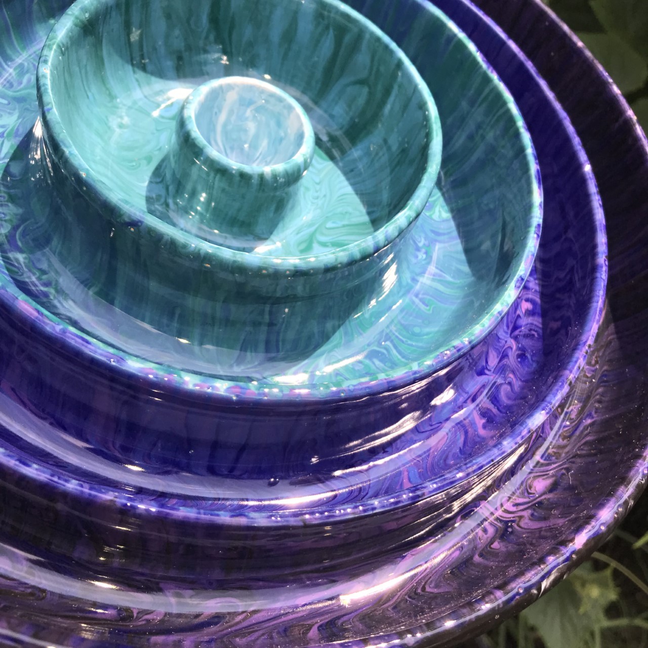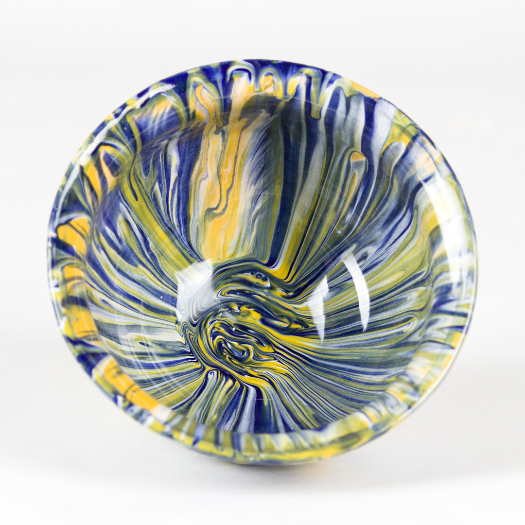 I choose to invest in Stroke & Coat by Mayco because it mimics the properties of paint. Its highly pigmented formula is applied with a brush, colors match expected color outcome, intermixability for new hues, and are stable like an underglaze with the shine of glaze. Amidst a winter pandemic shutdown, I daydreamed for days on how to glaze bowling ball swirls. “What if we use the acrylic paint pour cup method with Stroke and Coat?!”