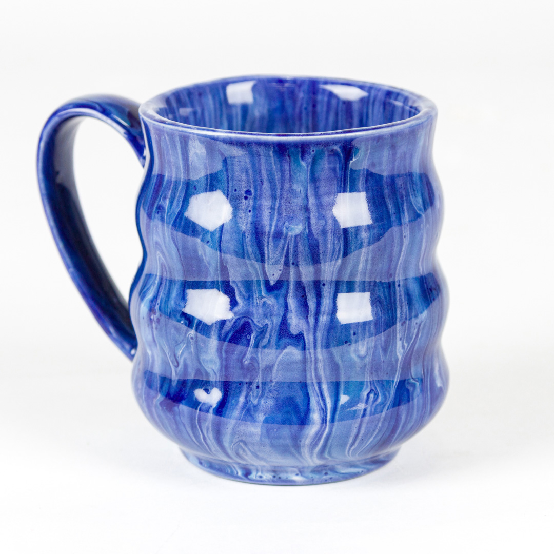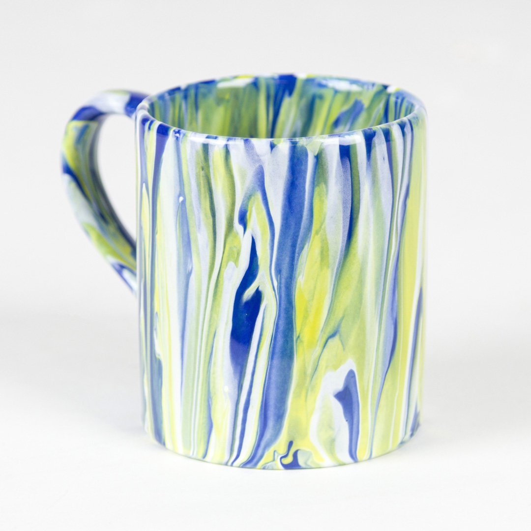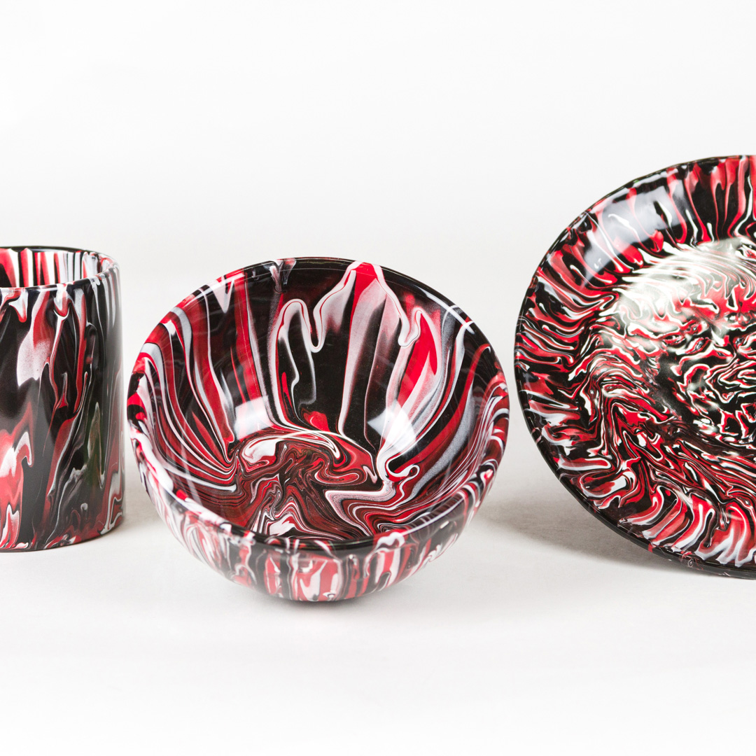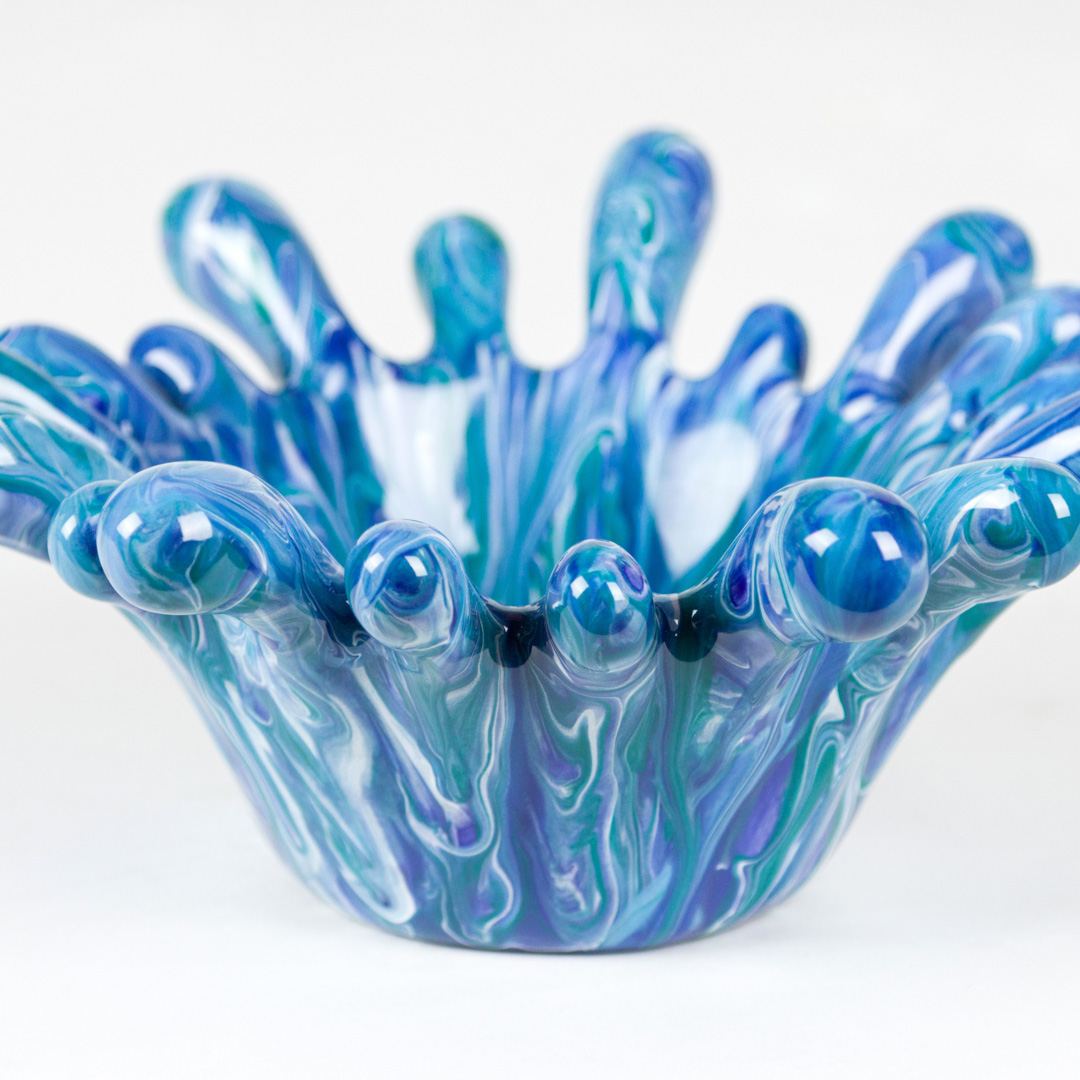 I choose to invest in Stroke & Coat by Mayco because it mimics the properties of paint. Its highly pigmented formula is applied with a brush, colors match expected color outcome, intermixability for new hues, and are stable like an underglaze with the shine of glaze. Amidst a winter pandemic shutdown, I daydreamed for days on how to glaze bowling ball swirls. “What if we use the acrylic paint pour cup method with Stroke and Coat?!”