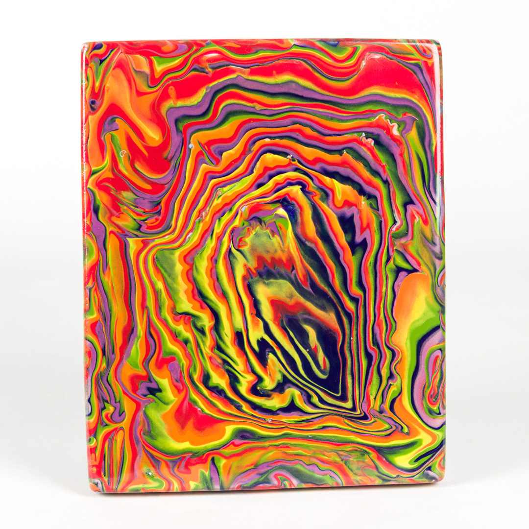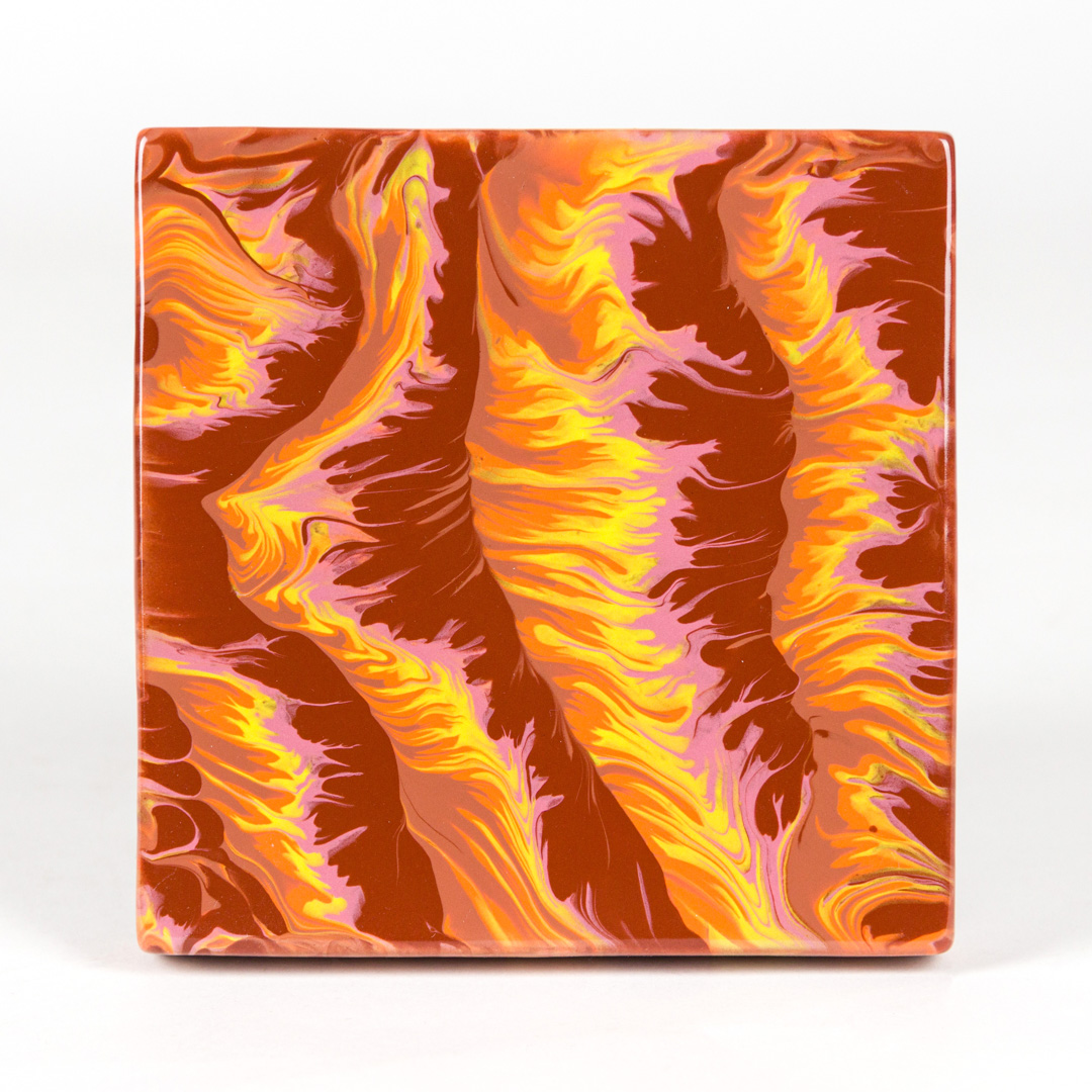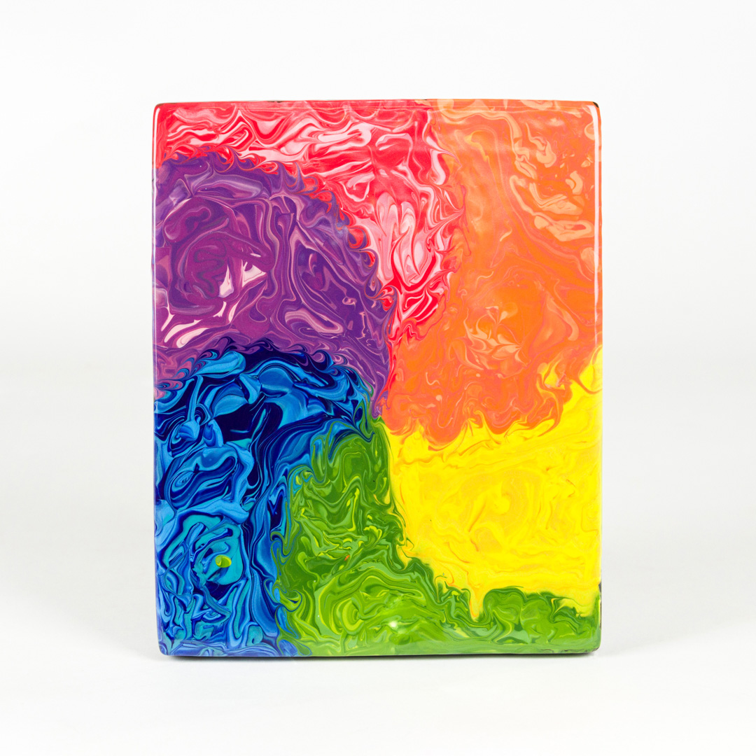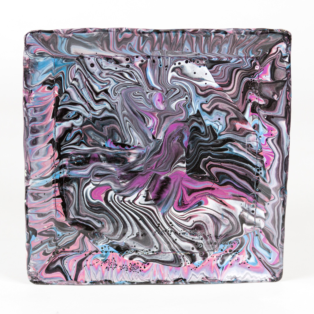 Why teach Glaze Pour Painting? Aesthetically, results are vibrant including remarkable intermixing, shine, depth & permanence. Academically, there is minimal waste due to the porous surface and interdisciplinary concepts are taught concurrently. Connections include the chemical reaction of the glazing process, viscosity, and what earthen materials melt to make glaze’s colorful waterproof surface that was a huge social/technological advancement. Stroke & Coat is very densely pigmented which can be thinned up to 15% with water for desired effects and increases supply for the classroom. Expand the process by incorporating wax resists, stencils, or other specialty glazes like Sculpting Medium or Cobblestone also alter the glaze path across the surface with replicable yet endless results. Glaze Pouring on greenware eliminates extra time-consuming kiln firings. Gassing off during this once-fired process will create temporary bubbles through glaze that produce the look of paint/silicone “cells.” In mid-range firings, Stroke & Coat produces true Reds that do not “burn out” (cone 6). Foundations glazes are more economical and do not need to be thinned but translucency does necessitate smart color theory to avoid neutral tones. Glaze Pour Painting absolutely works on functional or sculptural pieces with masking tape, brushes, silicone cups, and a misting bottle conquering most obstacles.