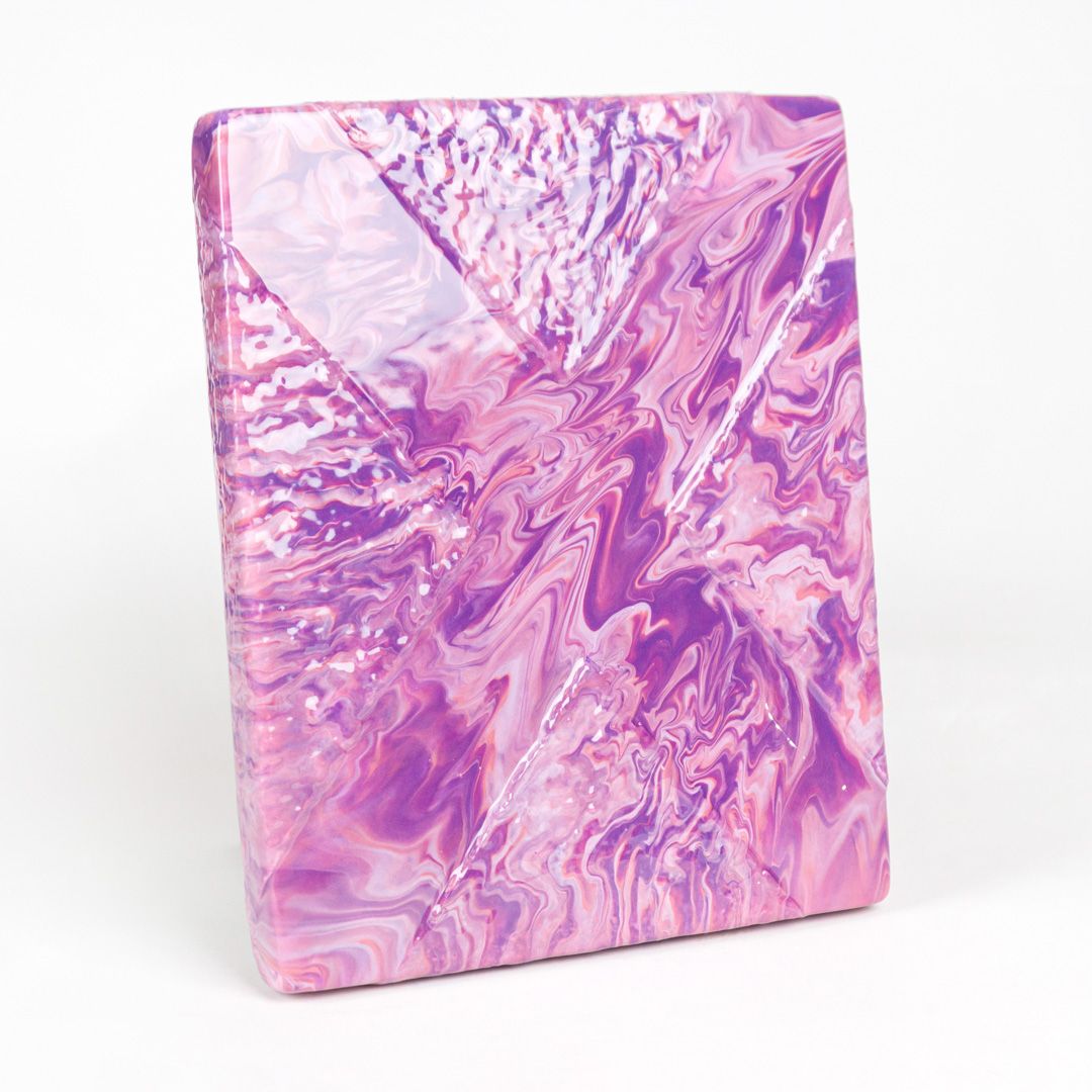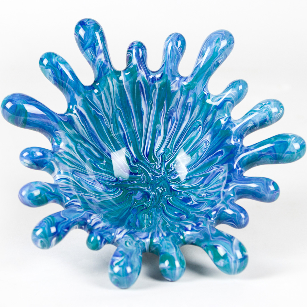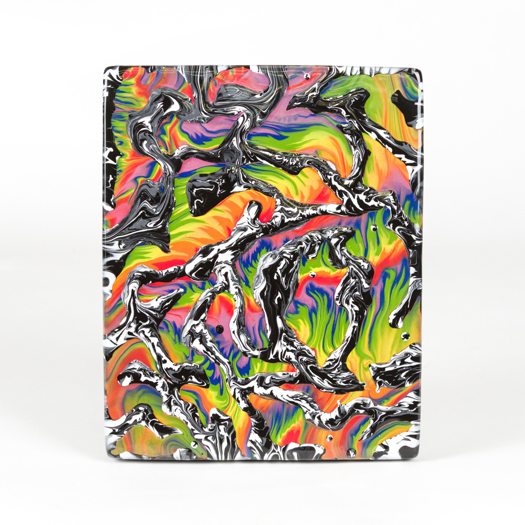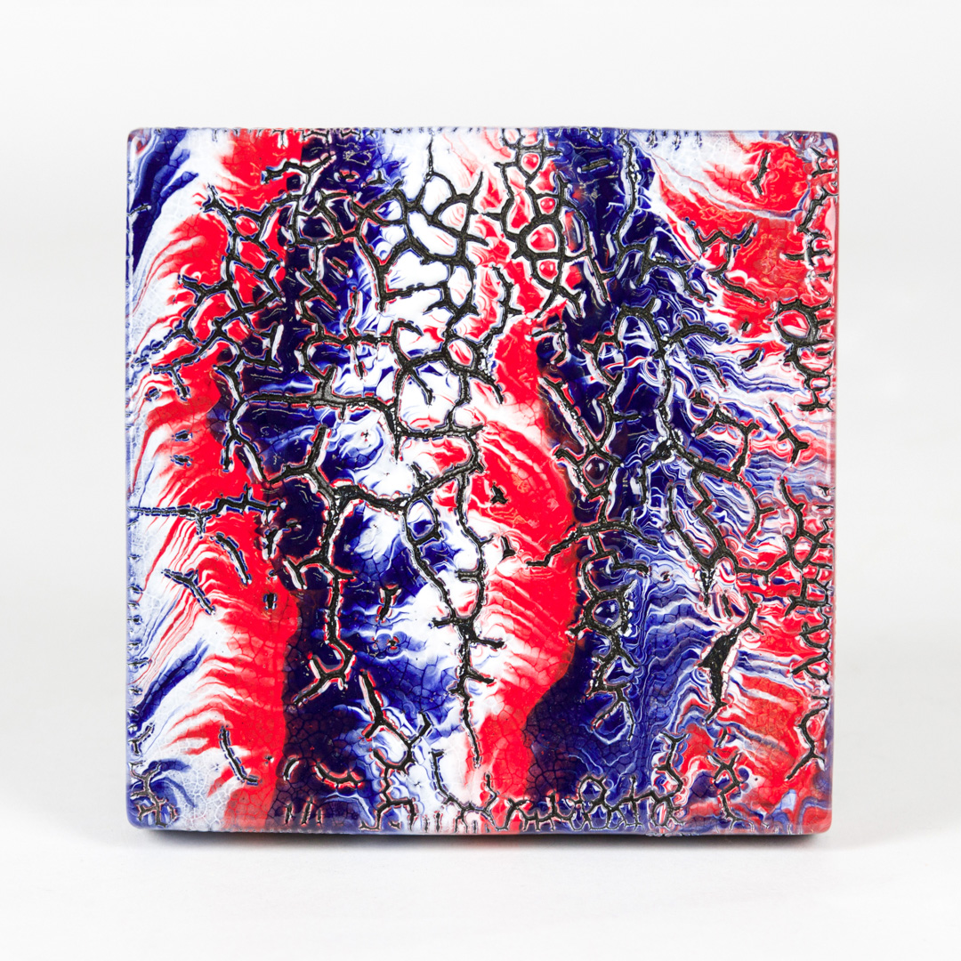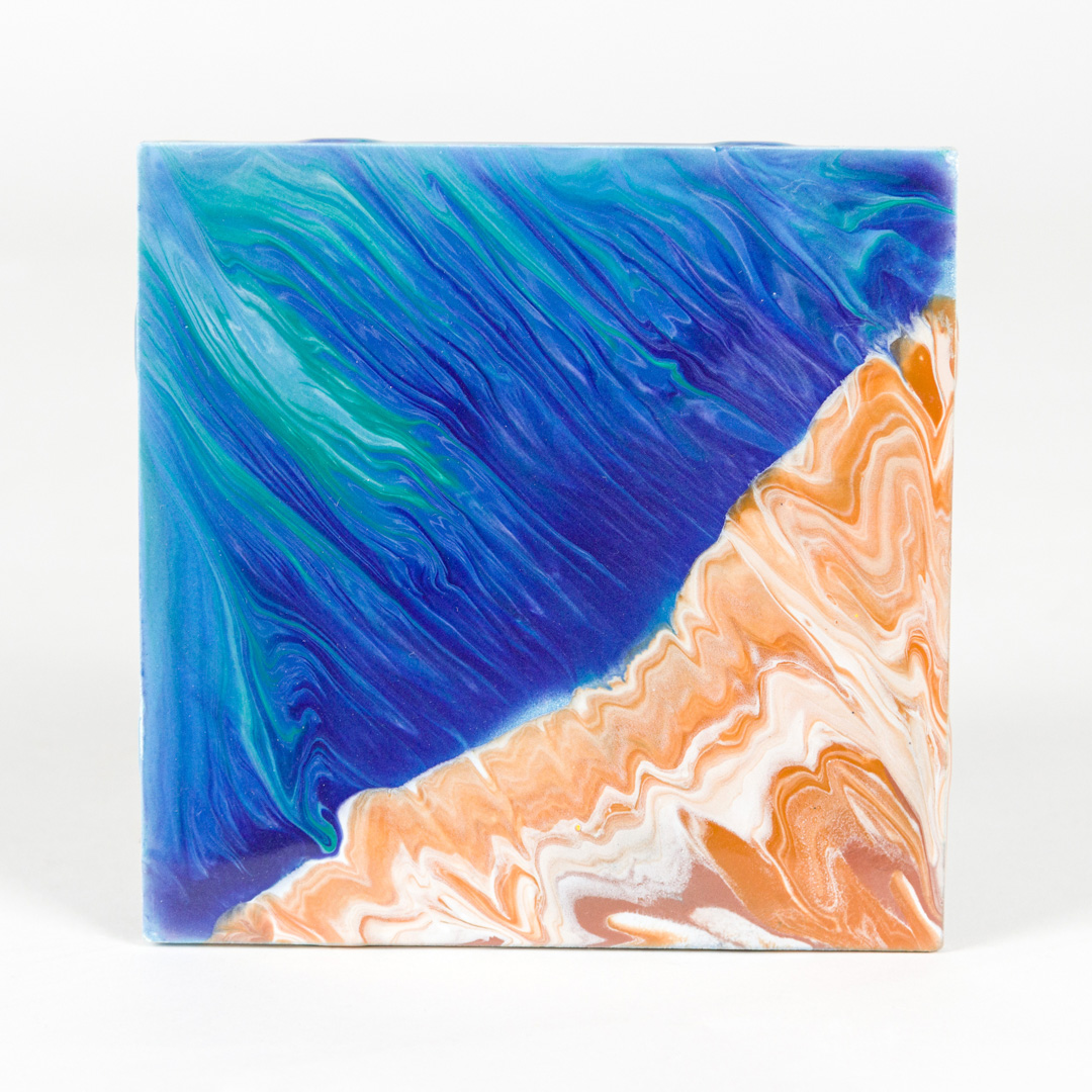 Why teach Glaze Pour Painting? Aesthetically, results are vibrant including remarkable intermixing, shine, depth & permanence. Academically, there is minimal waste due to the porous surface and interdisciplinary concepts are taught concurrently. Connections include the chemical reaction of the glazing process, viscosity, and what earthen materials melt to make glaze’s colorful waterproof surface that was a huge social/technological advancement. Stroke & Coat is very densely pigmented which can be thinned up to 15% with water for desired effects and increases supply for the classroom. Expand the process by incorporating wax resists, stencils, or other specialty glazes like Sculpting Medium or Cobblestone also alter the glaze path across the surface with replicable yet endless results. Glaze Pouring on greenware eliminates extra time-consuming kiln firings. Gassing off during this once-fired process will create temporary bubbles through glaze that produce the look of paint/silicone “cells.” In mid-range firings, Stroke & Coat produces true Reds that do not “burn out” (cone 6). Foundations glazes are more economical and do not need to be thinned but translucency does necessitate smart color theory to avoid neutral tones. Glaze Pour Painting absolutely works on functional or sculptural pieces with masking tape, brushes, silicone cups, and a misting bottle conquering most obstacles.