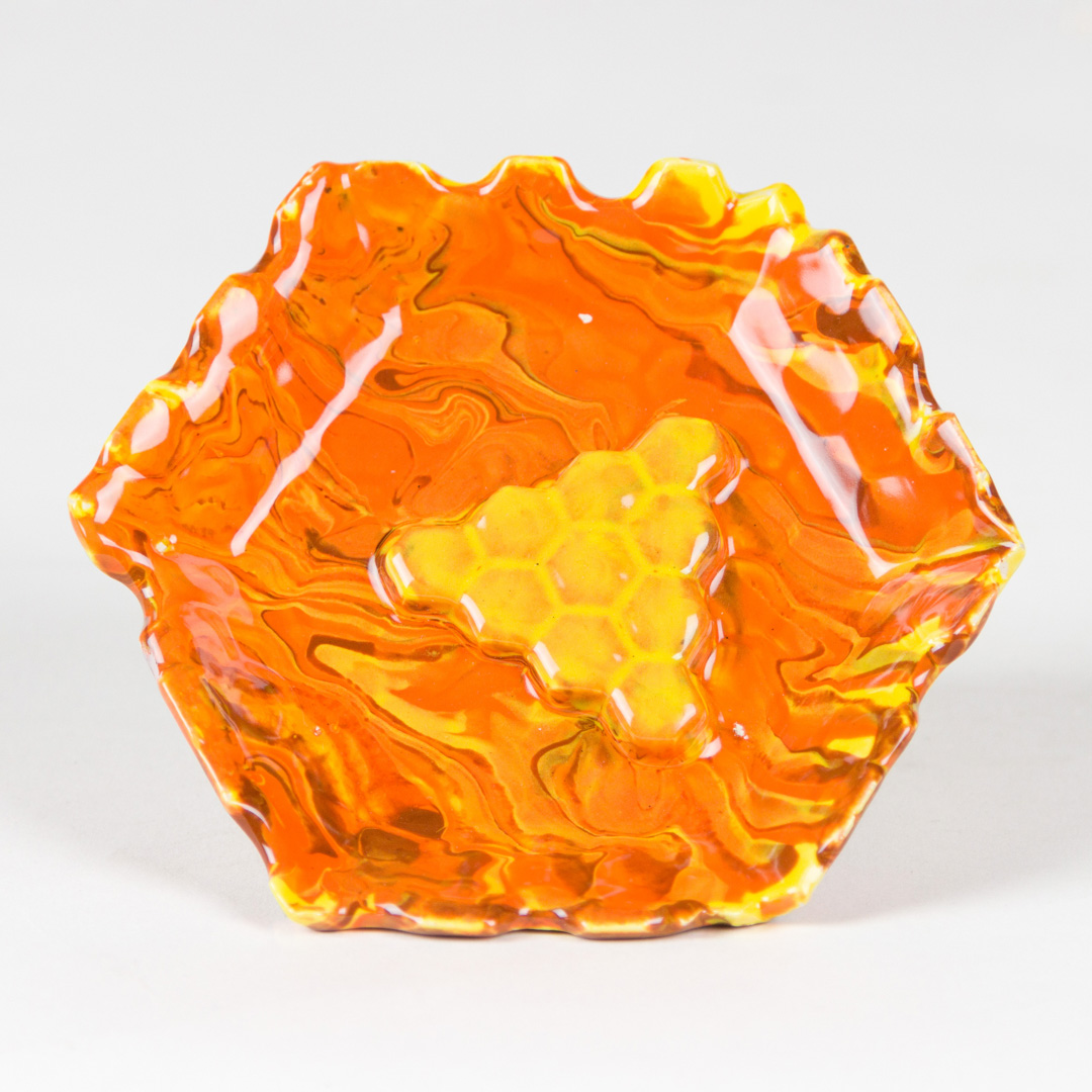 Upon returning I asked Gavin “Are you willing to try something?” Eagerly, a base layer of glaze was brushed on his bisque. Using a recycled condiment cup, he layered Hot Tamale, Orange-A-Peel, and Sunkissed glaze. I demonstrated pouring a small stream of tri-colored glaze on the surface of his ceramics. Even with difficult areas to reach, he wished to fire the outcome (cone 06). Opening the kiln lid revealed trust, honesty, scientific curiosity, and artistic creativity covering his sculpture. Vibrant combinations of fire-like swirls sparked many more “What ifs?”