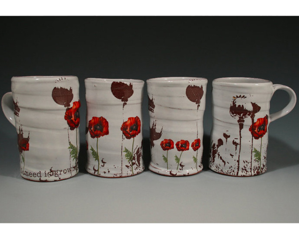 JR: I attended my first woodfiring as a high school student. This has always been an important and energizing component of my ceramic interests. Nearly 6 years ago I began experimenting with ceramic decals. I was initially drawn to iron transfers because of their durability and function across many clay bodies. Upon moving to Indiana 3 years ago I lost access to a high fire kiln, so I made the permanent switch to earthenware for my production work. I like the control I have with an electric kiln, but also I really love the way the red clay looks with a white glaze. I continue to wood fire because it is a way for me to connect directly with my ceramics colleagues in Goshen, but also because I use wood firing as a way to experiment with new forms and ideas. I feel like wood firing is what inspires my production earthenware pieces.