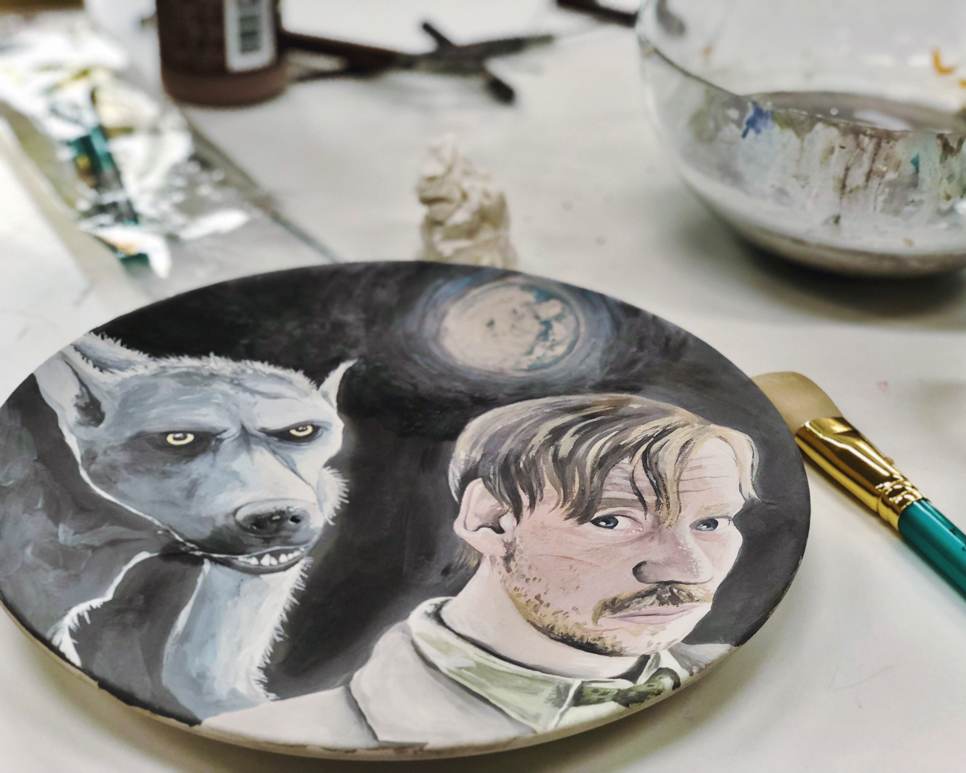 My style of work consists of realism and fan art. I’m very inspired by movies and the television shows that I watch, and when something really catches my eye I just have to paint it! I typically use Stroke & Coat glazes so I can get all the details just right and not have to worry about it moving around in the kiln.
