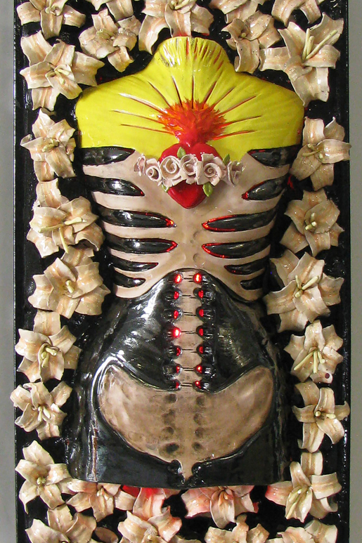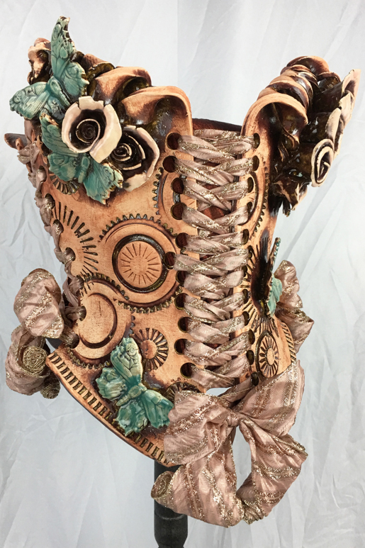 Nicole: I am an Oklahoma City based artist who works in Custom tile, hanging ceramic art, however I am best known for my one of a kind wearable ceramic corsets.