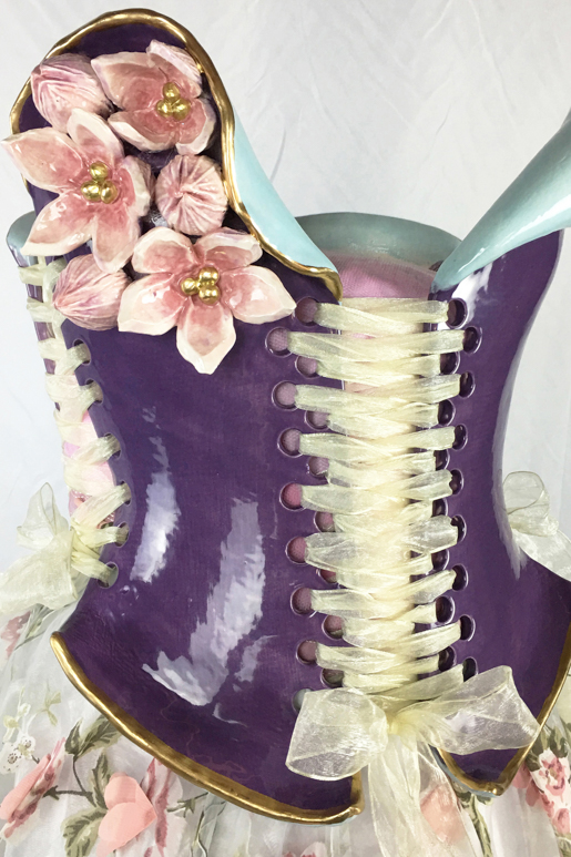 Time can vary from piece to piece. Most corsets are 4 pieces but they can be as many as 10 pieces. I engineered forms for different shaped of bodies. I use these as a base to shape my clay on. I roll my clay out as a slab and place it on my forms then sculpt into the surface or build on to the clay for more prominent pieces. Then I let it dry for a couple days before I fine tune the clay with water and a brush then fire the pieces in the kiln, glaze to dry for a couple days before I fine tune the clay with water and a brush then fire the pieces in the kiln, glaze to my desired Mayco colors before firing to a finished product.