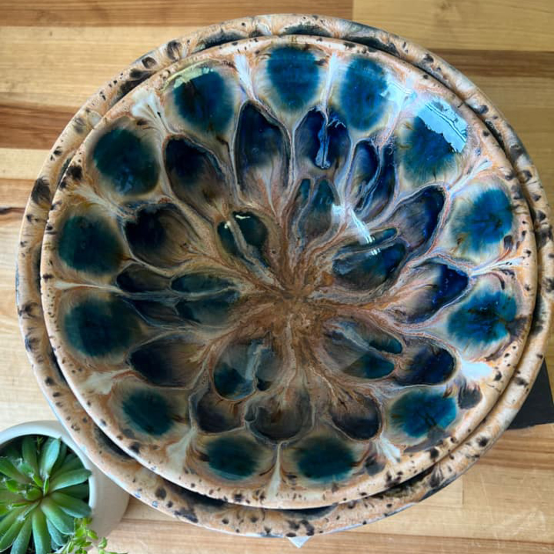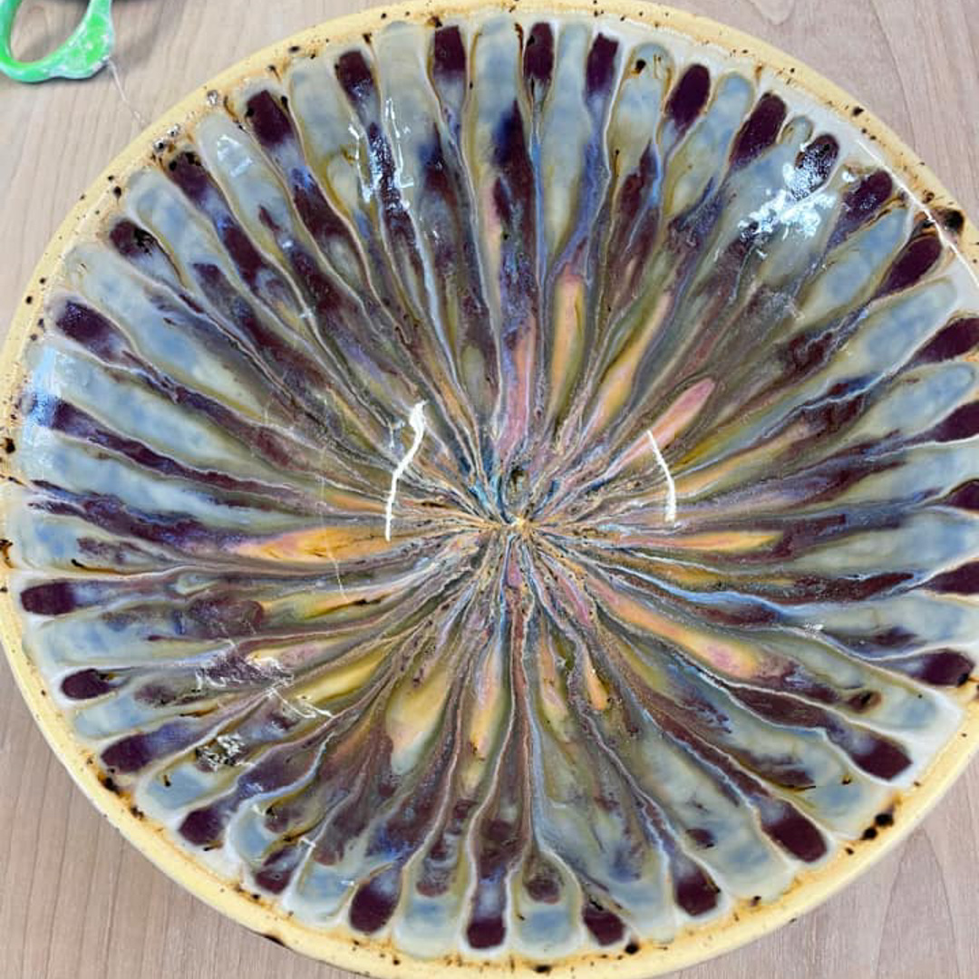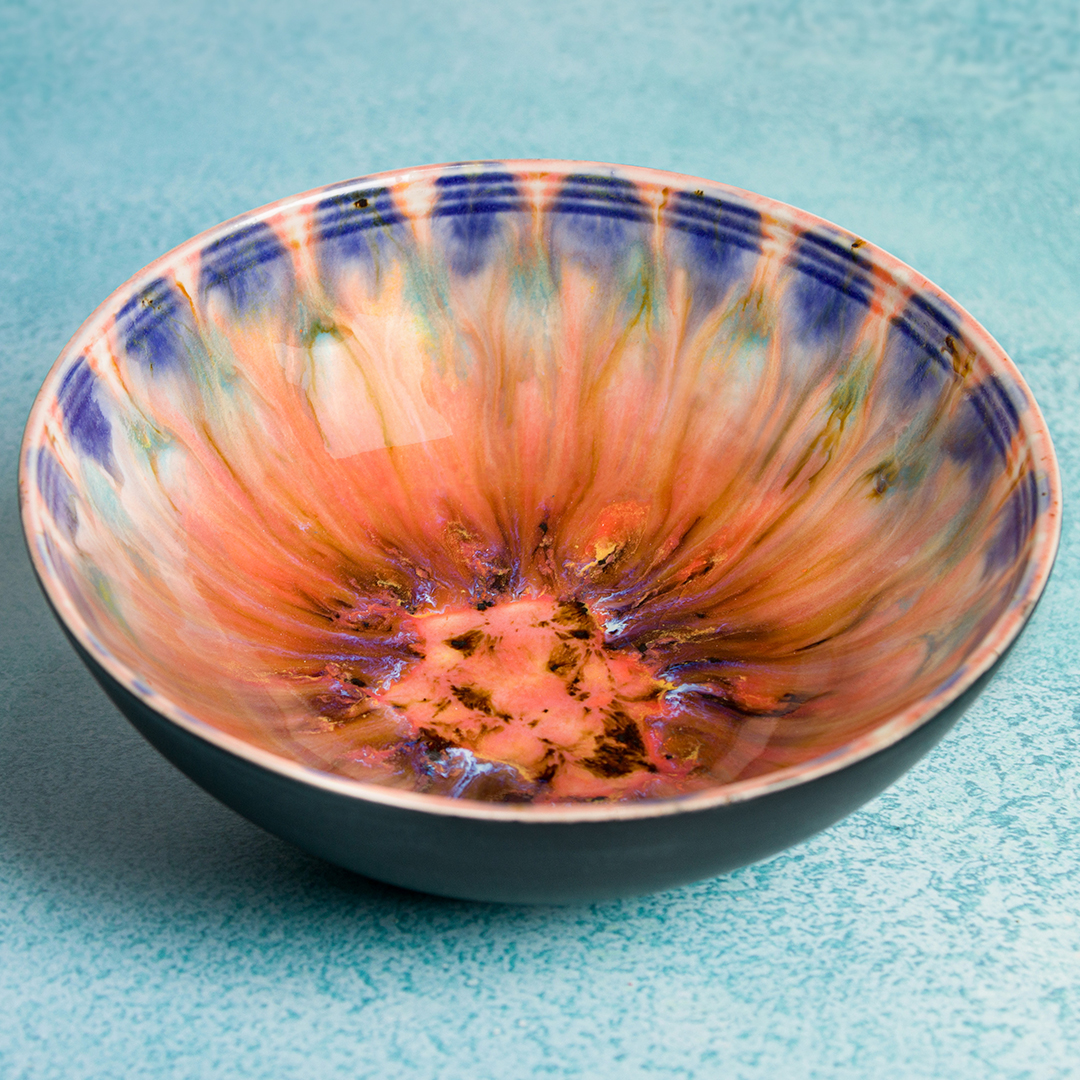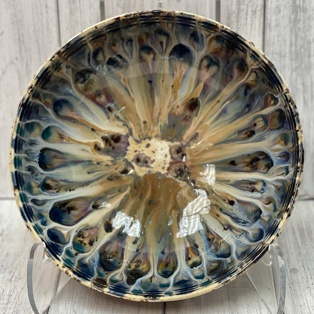The peacock glazing technique creates vibrant pops of color that swirl and move, resulting in dramatic effects. By combining different Stroke & Coat®, Stoneware Glazes, and Flux for mid-range, or Elements™ and Pottery Cascades™ for low-fire, artists achieve a dynamic reaction of captivating patterns with each firing.