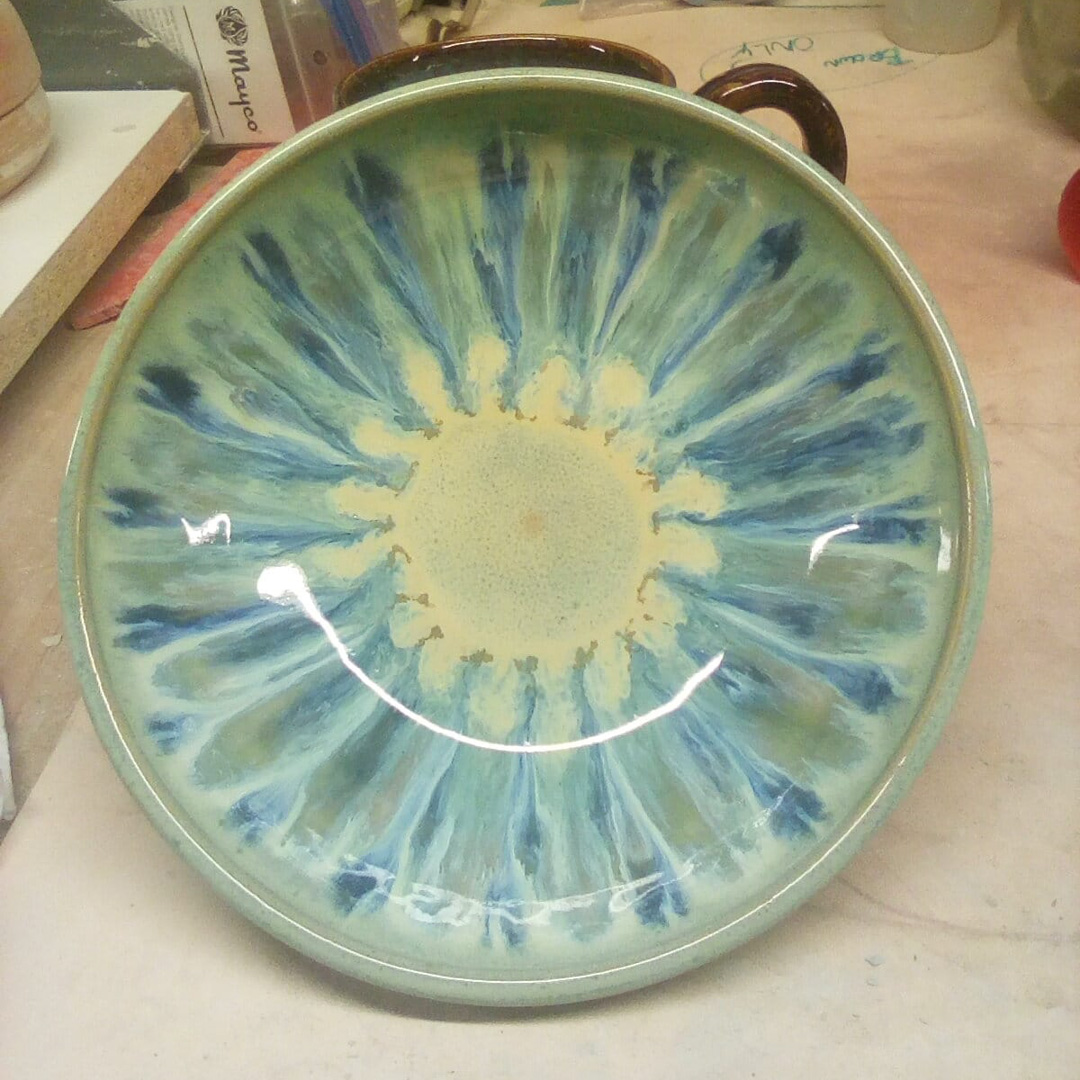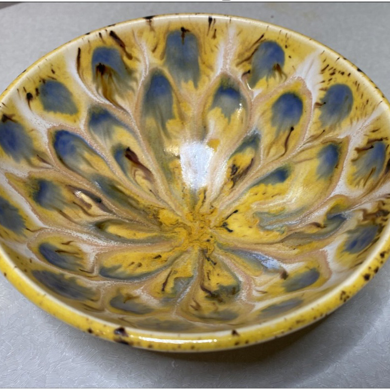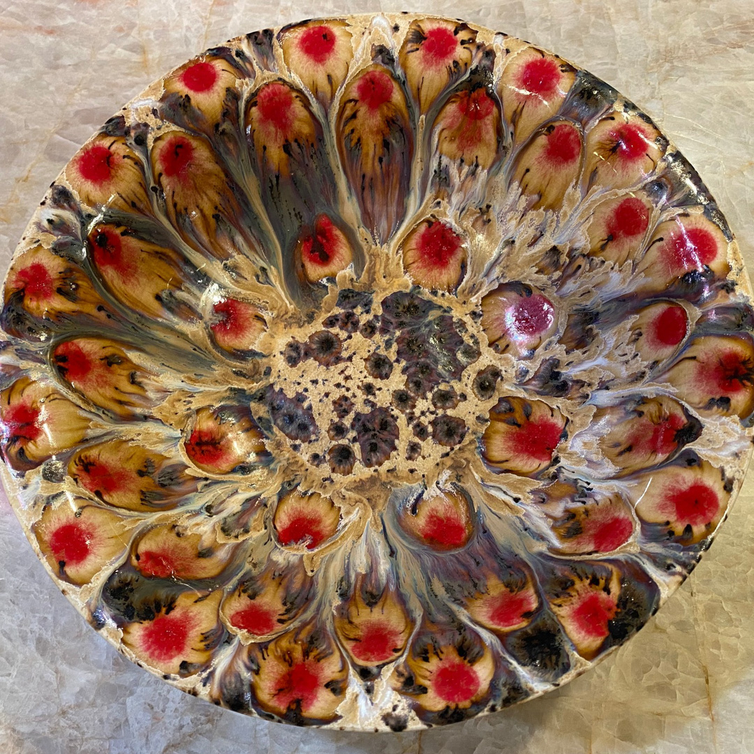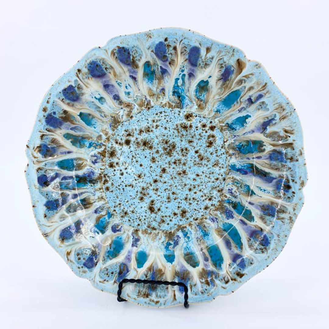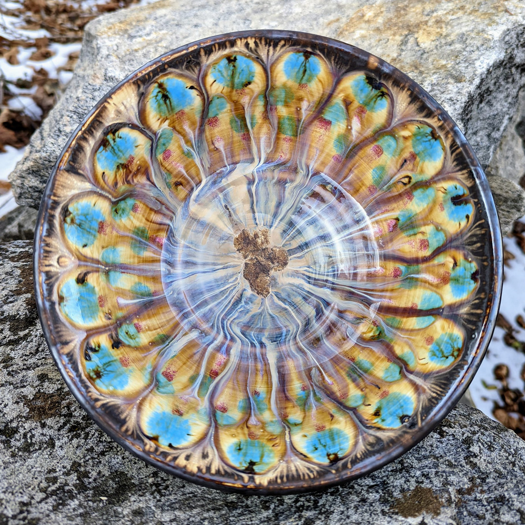 The peacock glazing technique creates vibrant pops of color that swirl and move, resulting in dramatic effects. By combining different Stroke & Coat®, Stoneware Glazes, and Flux for mid-range, or Elements™ and Pottery Cascades™ for low-fire, artists achieve a dynamic reaction of captivating patterns with each firing.