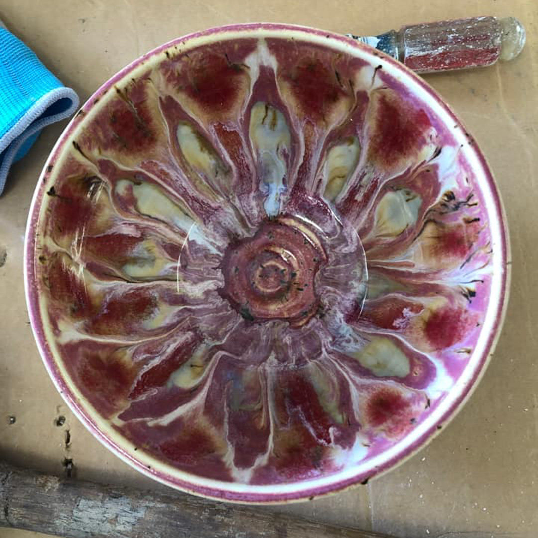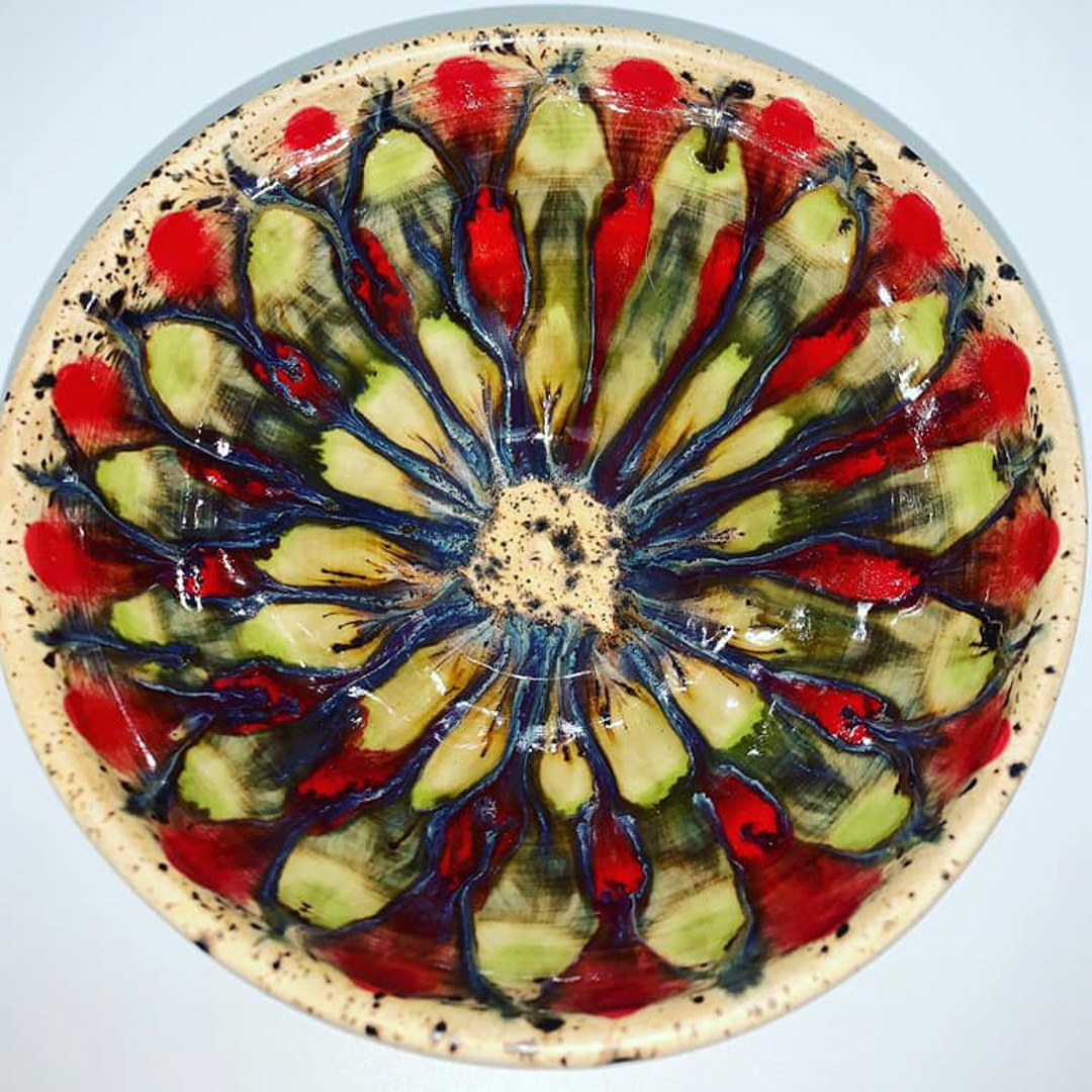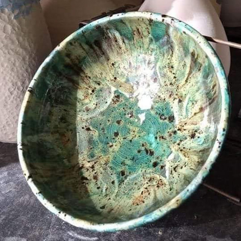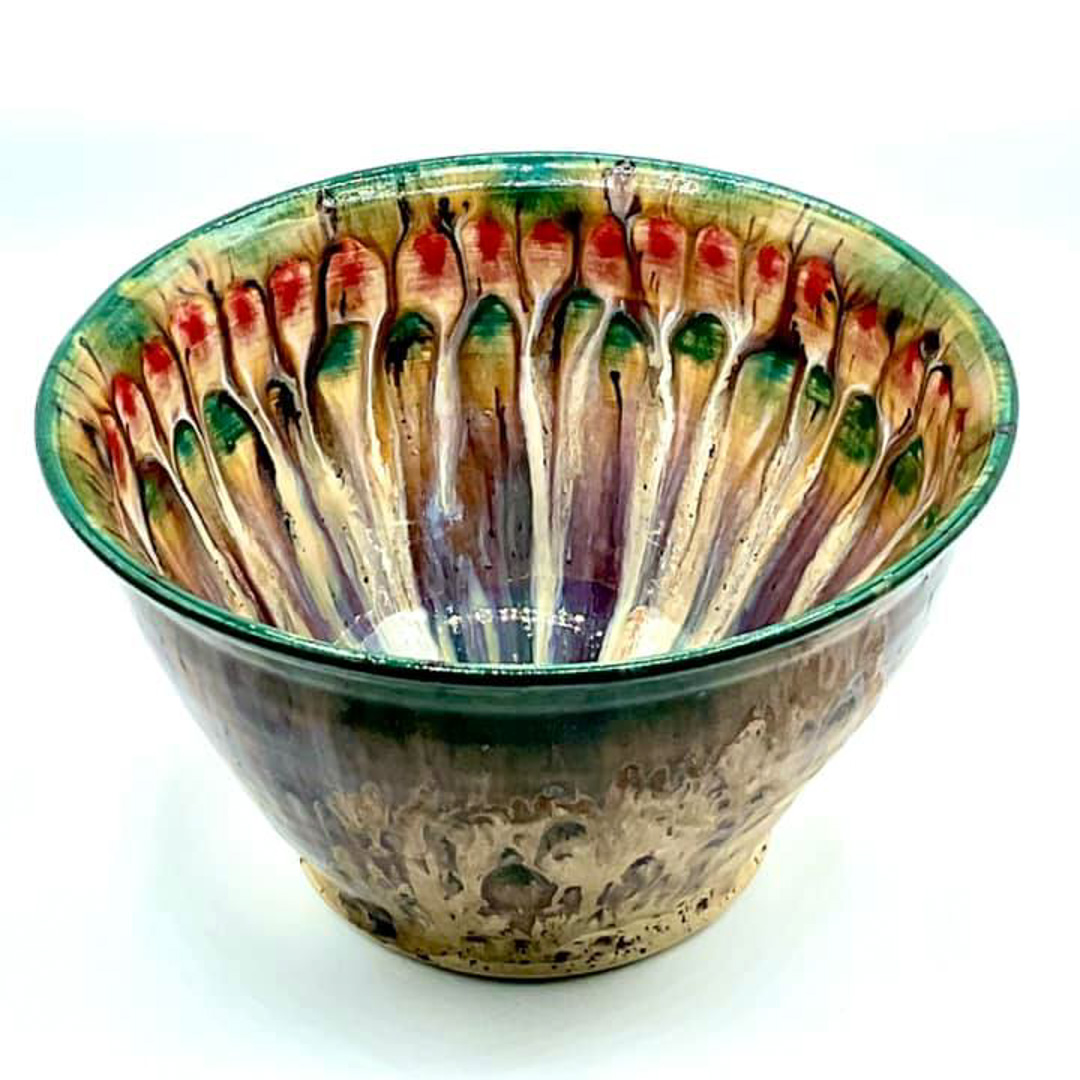The peacock glazing technique creates vibrant pops of color that swirl and move, resulting in dramatic effects. By combining different Stroke & Coat®, Stoneware Glazes, and Flux for mid-range, or Elements™ and Pottery Cascades™ for low-fire, artists achieve a dynamic reaction of captivating patterns with each firing.