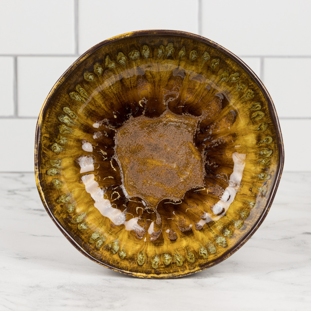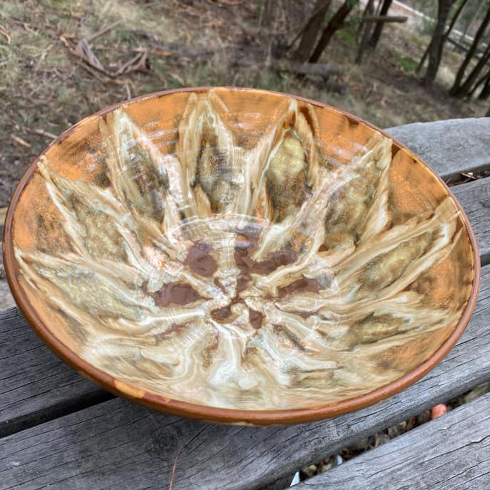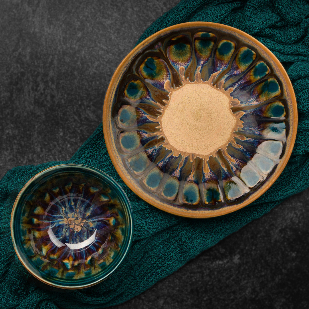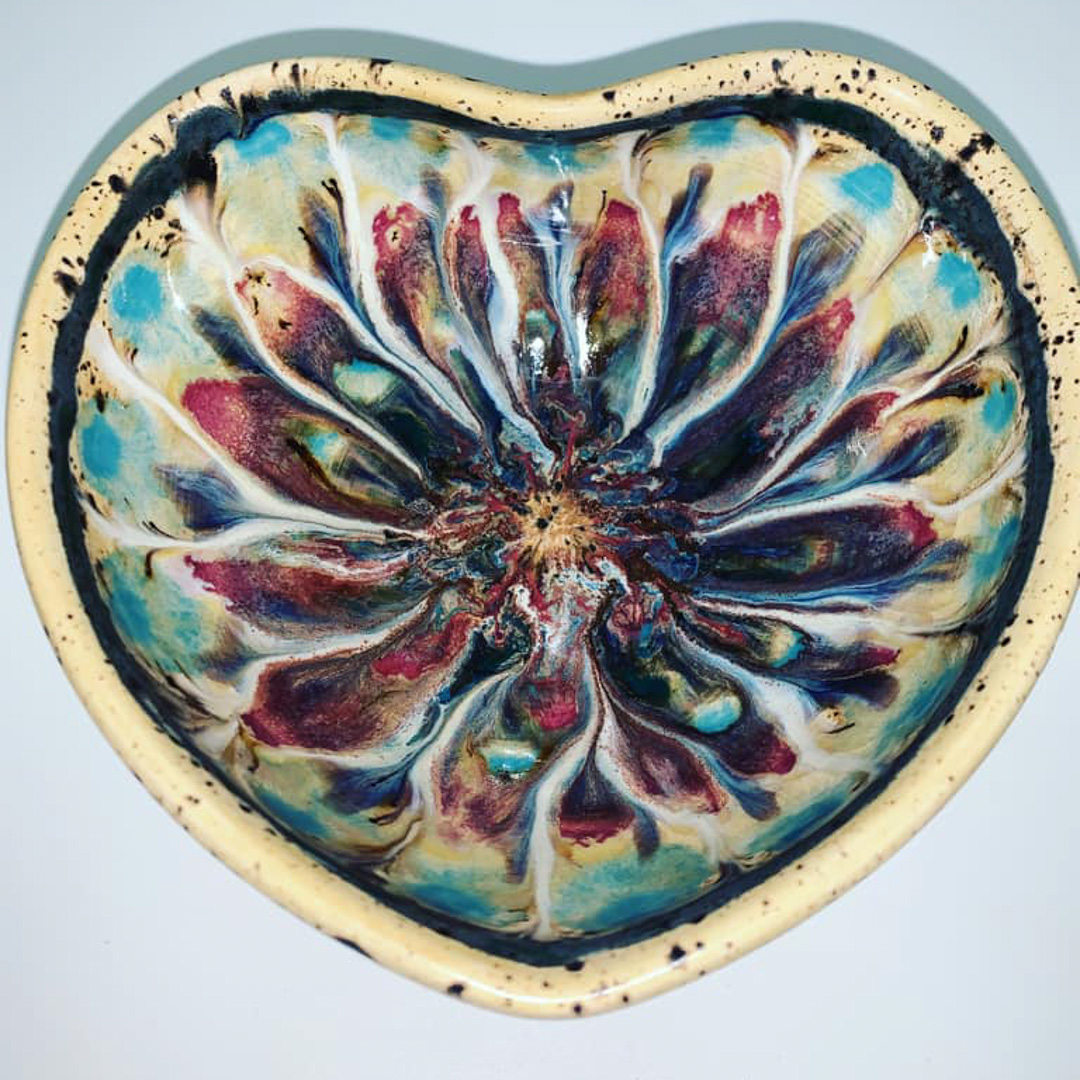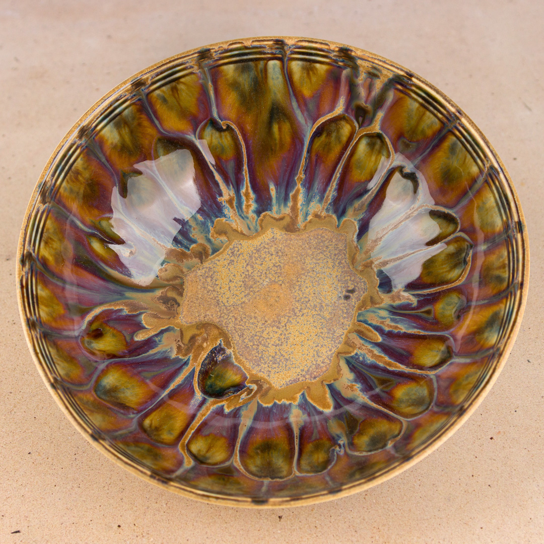 The peacock glazing technique creates vibrant pops of color that swirl and move, resulting in dramatic effects. By combining different Stroke & Coat®, Stoneware Glazes, and Flux for mid-range, or Elements™ and Pottery Cascades™ for low-fire, artists achieve a dynamic reaction of captivating patterns with each firing.