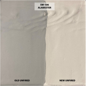 UPDATE: February 2, 2022: Despite our best efforts, the discontinuation of AmTalc 98 has slightly changed the fired result. Users will notice a slight shift in the fired color result. Please note that the fired result is dependent on firing temperature, atmospheric conditions of the kiln, application, and underlying clay body. The crystal loading has not changed. See below for the wet glaze color comparison of SW-106 Alabaster and the comparison of fired results on chips.