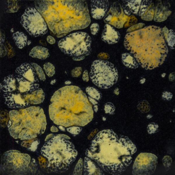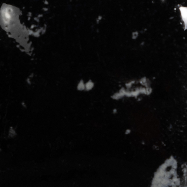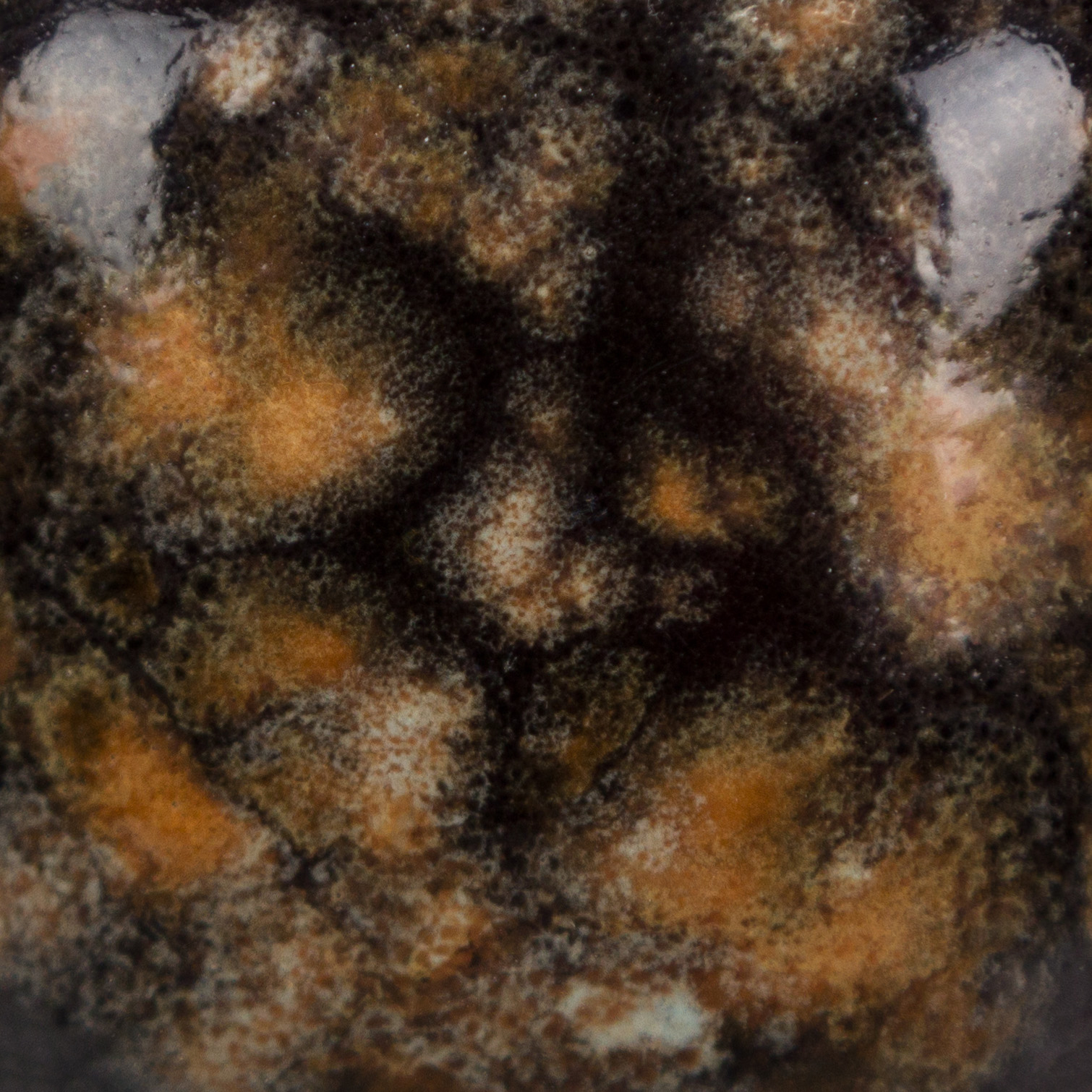 Cone 06 oxidation (large photo): Black Iris is an opaque black base glaze with a variety of golden/yellow/brown crystals.