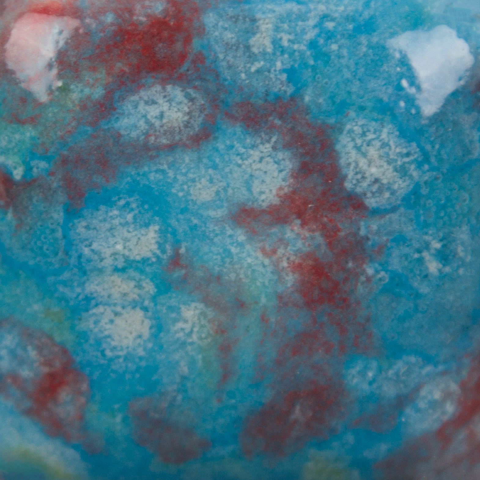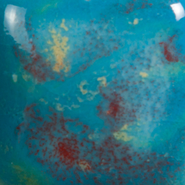 Cone 06 oxidation (large photo): Monet’s Pond is a translucent, bright blue base glaze with red, green, and yellow crystals.