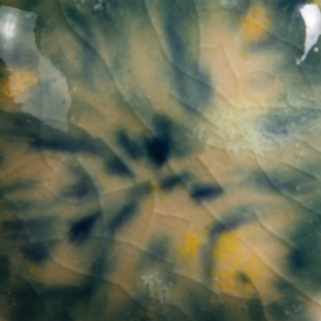 Cone 6 oxidation (small photo): Base glaze fades – crystals fade and melt. Enhanced mobility. Surface issues may occur.