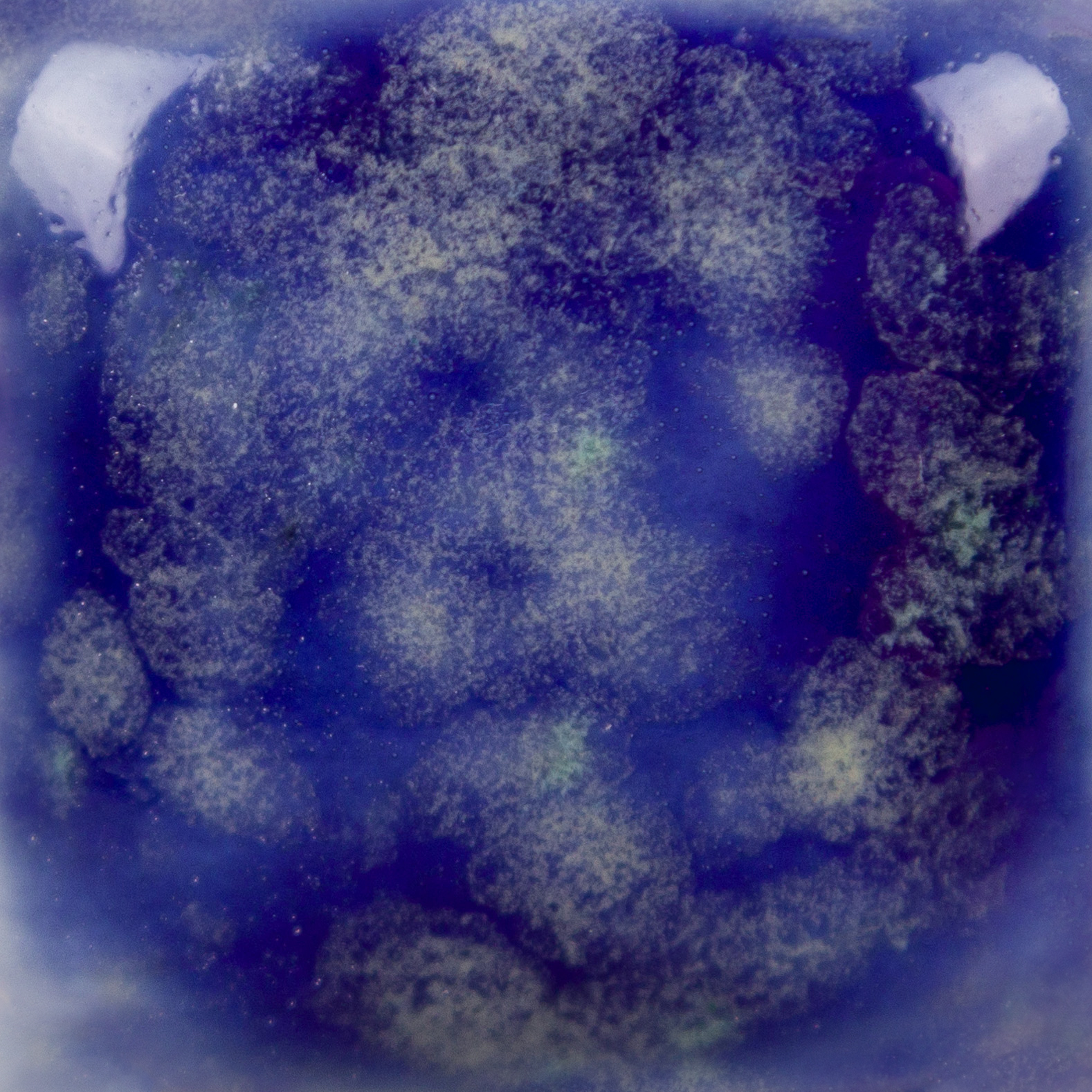 Cone 06 oxidation (large photo): Starry Night is a semi-opaque, cobalt blue base glaze with a variety to yellow crystals.