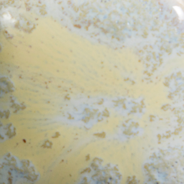 Cone 06 oxidation (large photo): Foggy Mist is a semi-translucent, light gray base glaze with brown and golden crystals.
