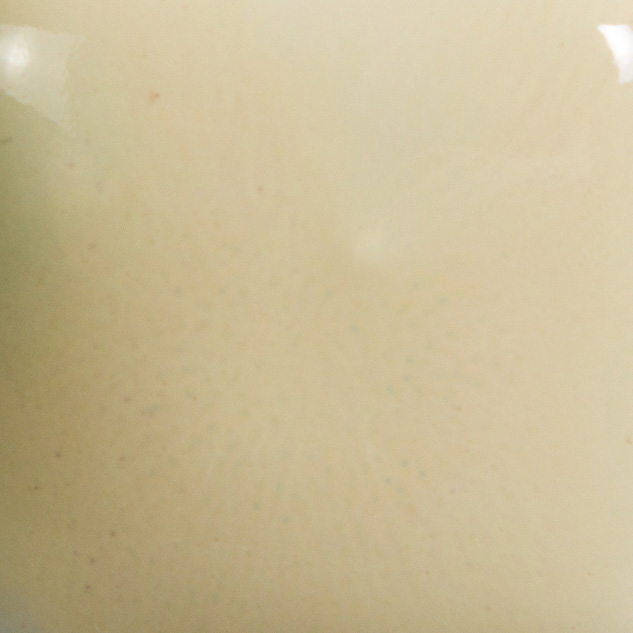 Cone 6 oxidation (small photo): Base glaze changes to cream – crystals fade completely. Enhanced mobility. Surface issues may occur.