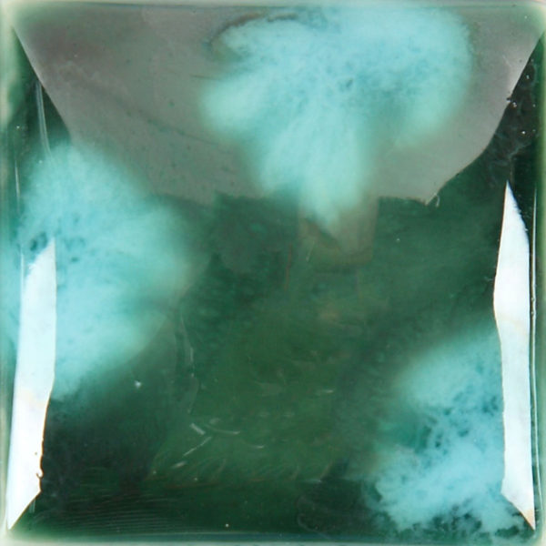 Cone 06: Emerald Falls is a semi-opaque, emerald, green base glaze with turquoise blue crystals.