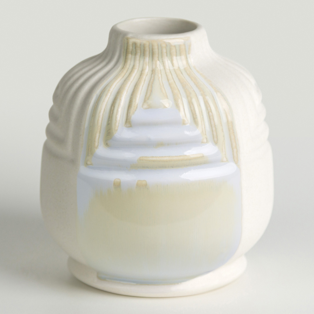 Cone 6 oxidation (small photo): Color changes to an opaque cream that breaks over texture and pools white. Enhanced mobility. Surface issues may occur.