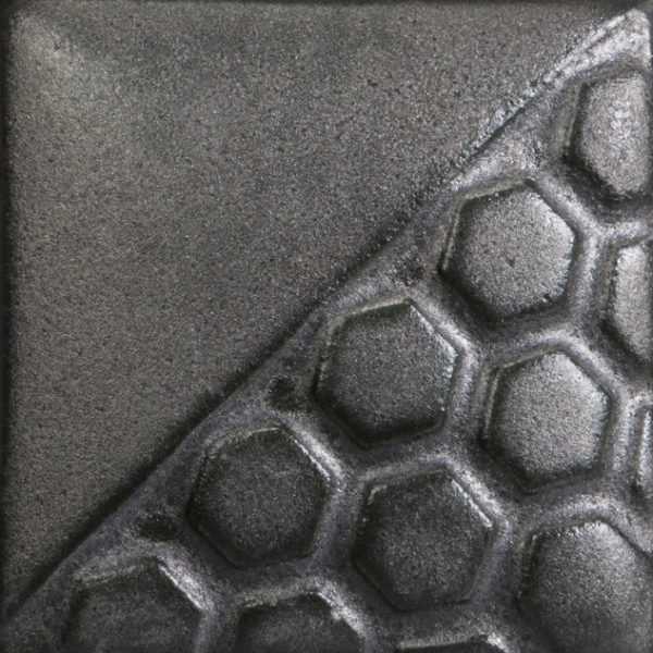 Cone 6 oxidation (small photo): Color changes to a metallic black that breaks over texture and pools a flat metallic gray. Enhanced mobility. Surface issues may occur. Not dinnerware safe.