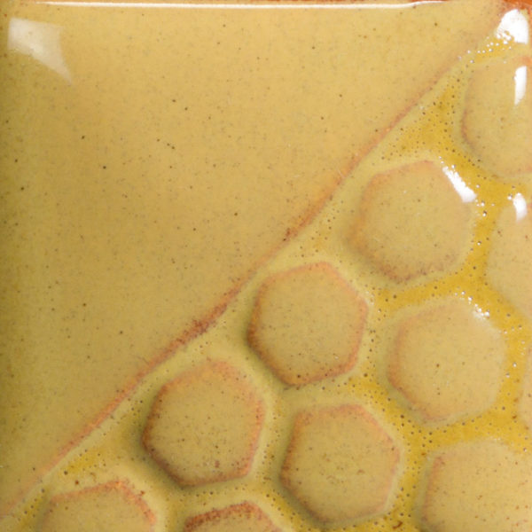 Cone 6 oxidation (small photo): Color changes to a semi-translucent, variegated gold/cream/brown that breaks over texture and pools cream. Enhanced mobility. Surface issues may occur.
