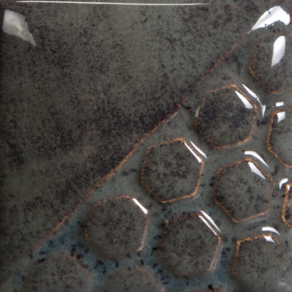 Cone 6 oxidation (small photo): Color changes to a semi-translucent, variegated brown/blue that breaks over texture and pools blue. Enhanced mobility. Surface issues may occur.
