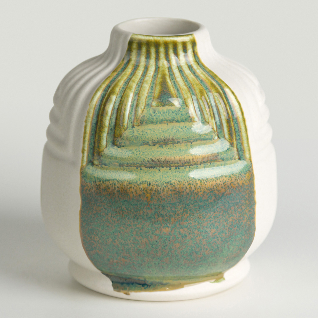 Cone 6 oxidation (small photo): Color changes to a semi-translucent, variegated olive green/blue that breaks over texture and pools blue. Enhanced mobility. Surface issues may occur.