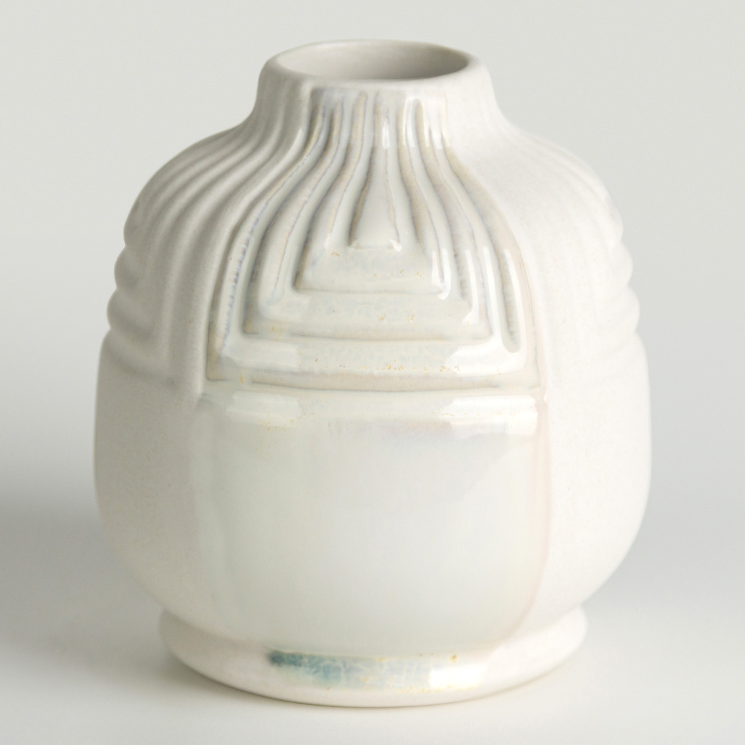 Cone 6 oxidation (small photo): Color changes to white and breaks over texture; yellow crystallization can occur. Enhanced mobility. Surface issues may occur.