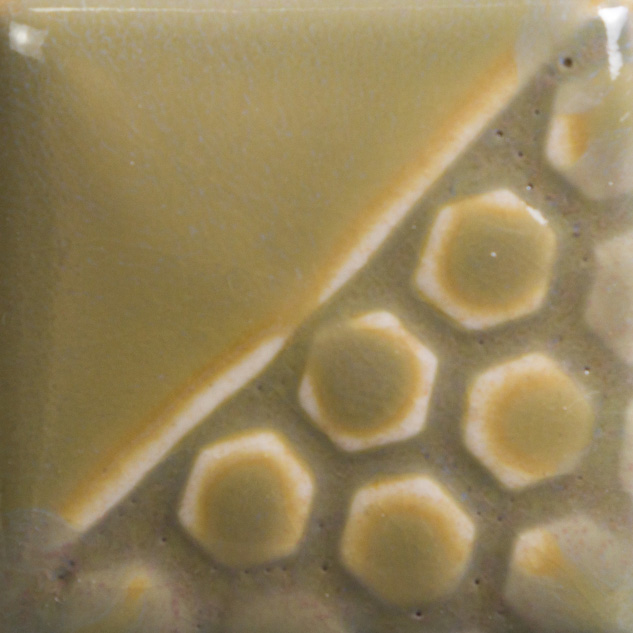 Cone 6 oxidation (small photo): Color changes to a semi-translucent, variegated green/gold/gray that breaks over texture. Enhanced mobility. Surface issues may occur.