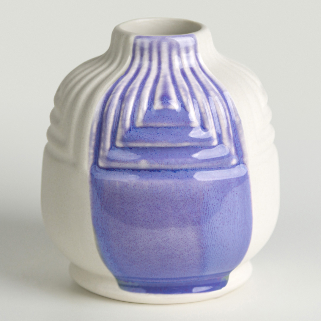 Cone 06 oxidation (large photo): Lavender Flower is a glossy, rich purple glaze that breaks blue.