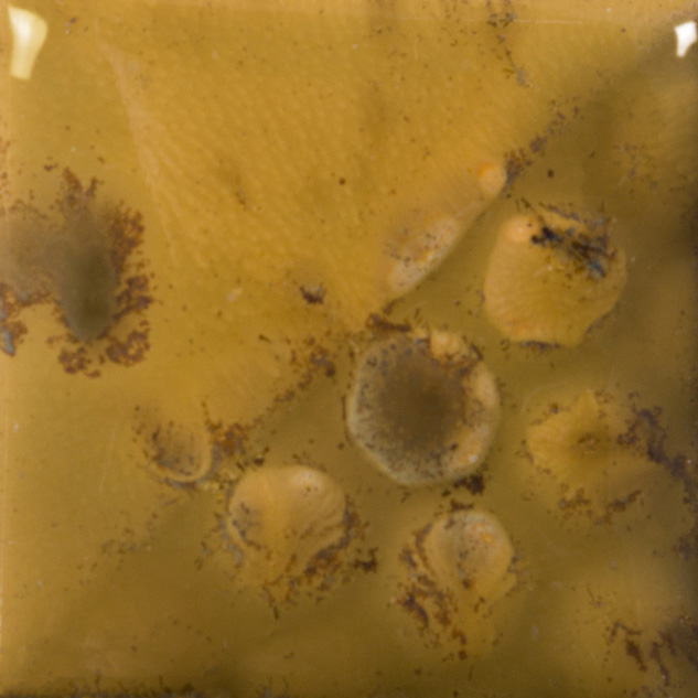 Cone 6 oxidation (small photo): Base glaze changes to gold/brown and breaks over texture; crystals become brown. Enhanced mobility. Surface issues may occur.