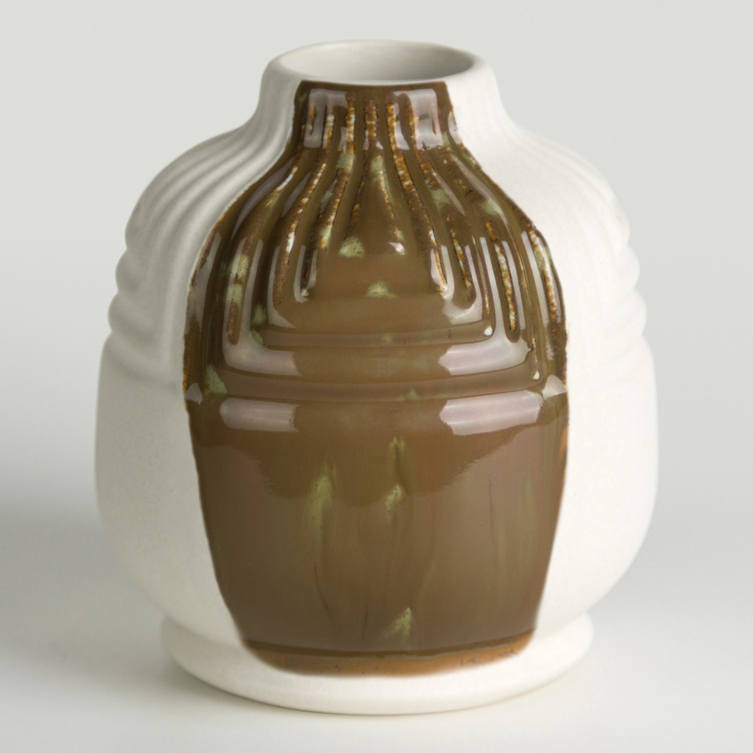 Cone 6 oxidation (small photo): Base glaze changes to brown/green and breaks over texture; crystals melt. Enhanced mobility. Surface issues may occur.