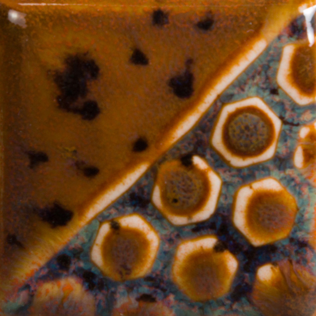 Cone 6: Color changes to a semi-translucent, variegated brown/orange/blue; orange crystals disappear and black crystals melt. Enhanced mobility. Surface issues may occur.