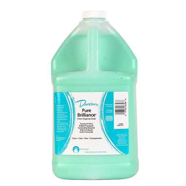 Duncan Pure Brilliance® Clear Glaze is a high-performance gloss clear glaze. Featuring a fast and stable dry time, this craze-resistant clear glaze enhances underglaze colors with brilliant shine and superior protection. The green color of Pure Brilliance Clear Glaze makes it easy for users to see where the glaze has been applied. Pure Brilliance Clear Glazes work beautifully over a variety of underglazes including Concepts®, Fundamentals® Underglazes, and EZ Stroke™. Pure Brilliance Clear Glazes are overglaze compatible