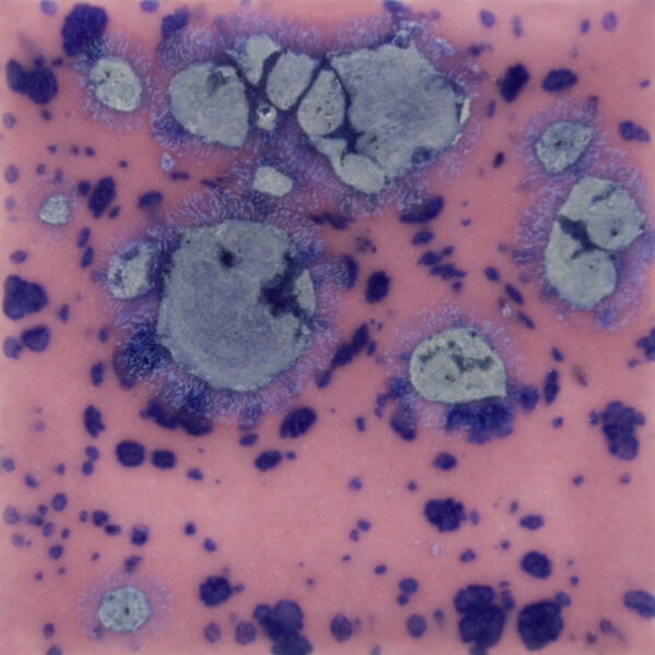 Cone 06 oxidation (large photo): Berryberry Pie is a translucent purple base glaze with blue crystals that bloom and a variety of blue specks.