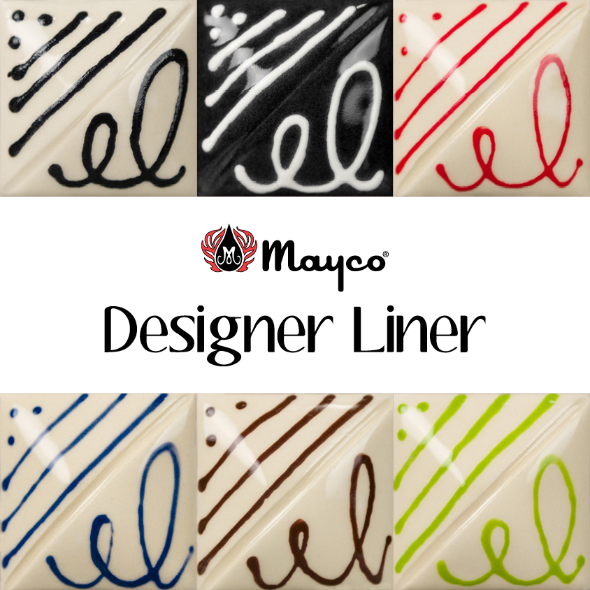 Designer Liner is clay based and heavily pigmented. The metal writer tip allows for ultimate control to draw ultra-fine or bold lines, typography and intricate illustration, or apply with a brush to create watercolor or ink wash effects. Designer Liner will fire matte when glaze is not applied over top.