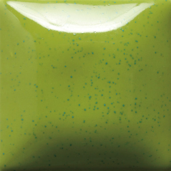 Cone 06 oxidation (larger image): Speckled Sour Apple is a heavily pigmented, viscous Stroke & Coat® glaze with blue specks that can be used for brush strokes or opaque coverage. One coat will create a translucent finish with subsequent coats adding opacity. We suggest two to three coats for full opacity and all over coverage. Will fire to a gloss finish without clear glaze.