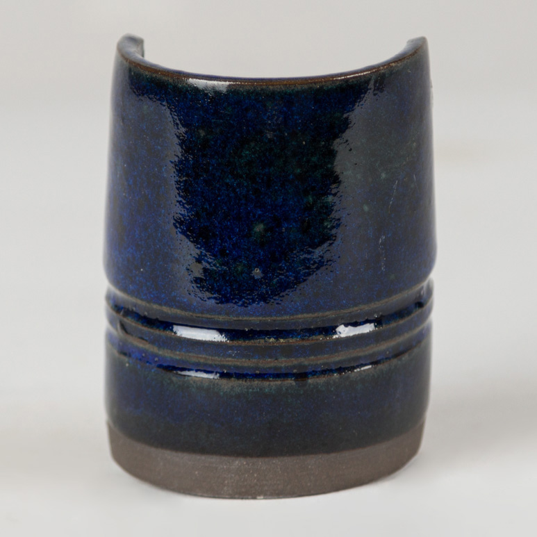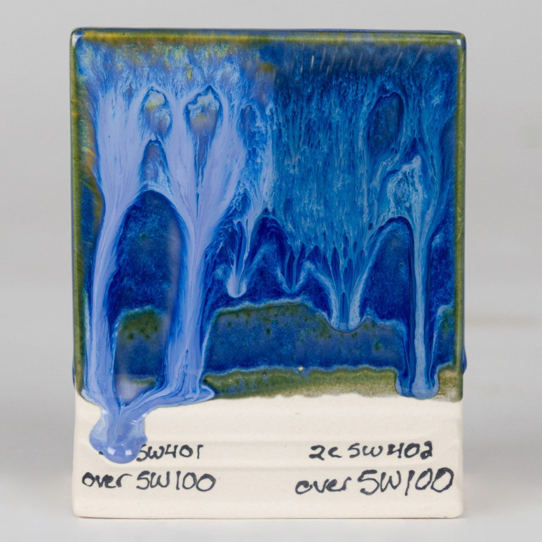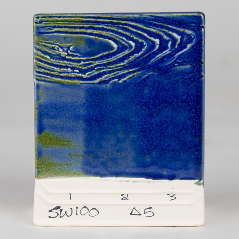 Cone 6: Blue Surf is a variegated cobalt blue glazes that breaks green.