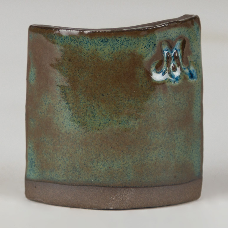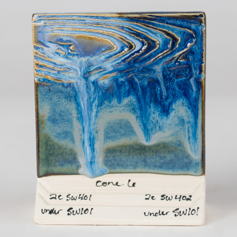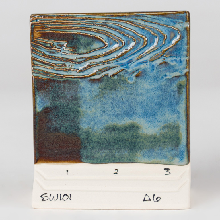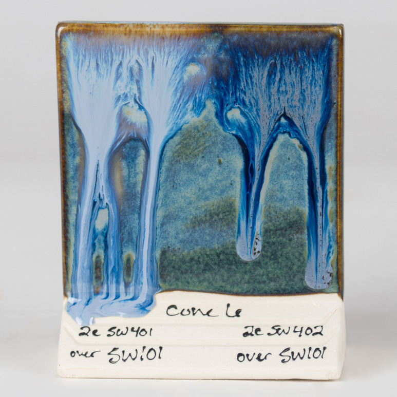 Cone 6 oxidation (larger image): Stoned Denim is a variegated blue glaze that breaks brown.