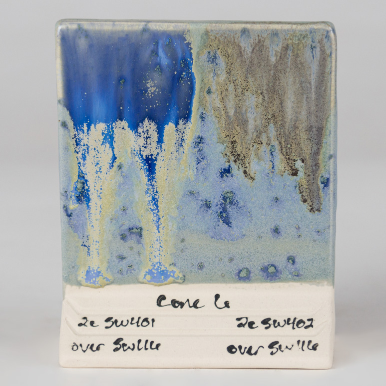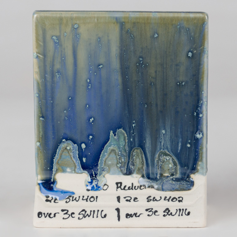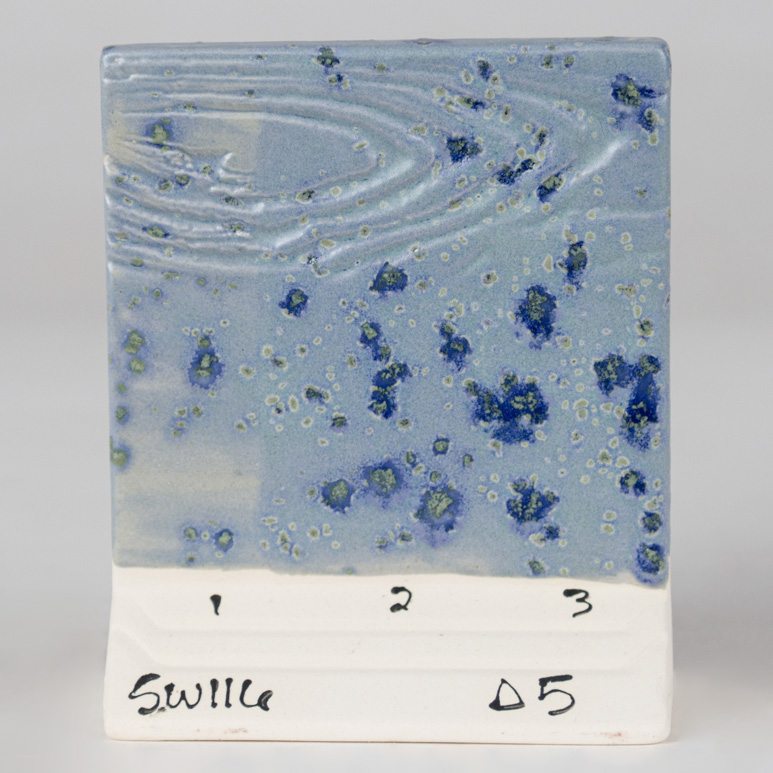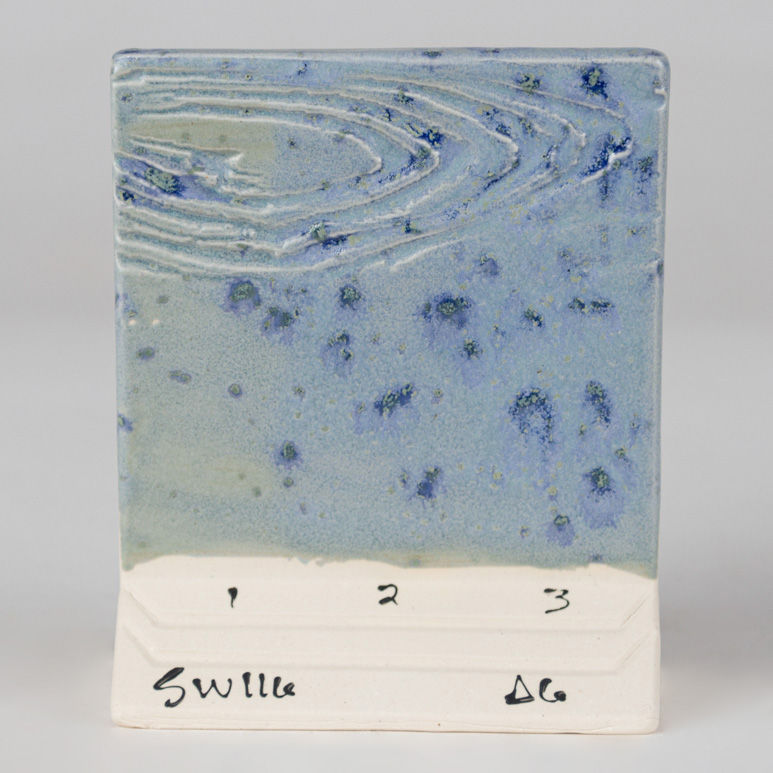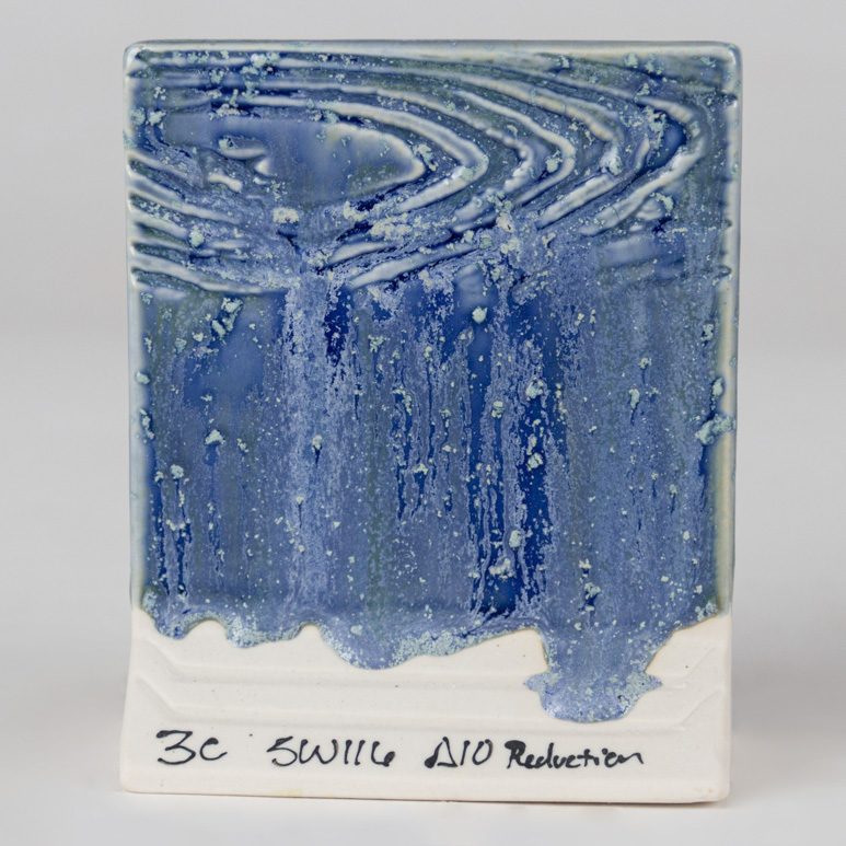 Chips shown are fired flat on a white clay body fired to cone 6 oxidation and cone 10 reduction. The choice of clay body, the thickness of glaze application, the firing process, and temperature will affect the fired results.