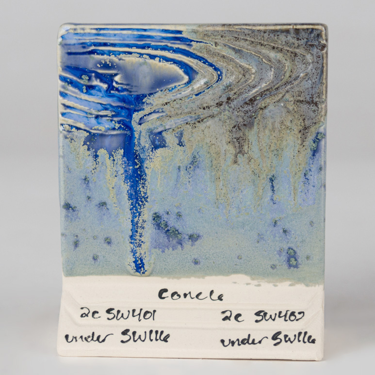 Stoneware crystal glazes are designed to expand upon the surface with dazzling bursts of color. Fired results will vary based on ware’s orientation. Crystals will settle to the bottom of the jar and will need a good mixing prior to initial use. Re-stir between each coat. Stir with palette knife or other unpainted tool. Avoid placing crystals near the bottom third of a vertical piece as they may cause additional movement during firing. Crystals will flow more than the base glaze. While the glaze is wet, use your fan brush to redistribute the crystals to achieve balanced coverage. Over-application or heavy deposition of the crystals can cause pinholing or running. When storing a crystal glaze, you may consider storing upside down to facilitate crystal dispersion on the next use.