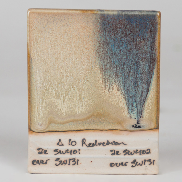 Chips shown are fired flat on a white clay body fired to cone 6 oxidation and cone 10 reduction. The choice of clay body, the thickness of glaze application, the firing process, and temperature will affect the fired results.